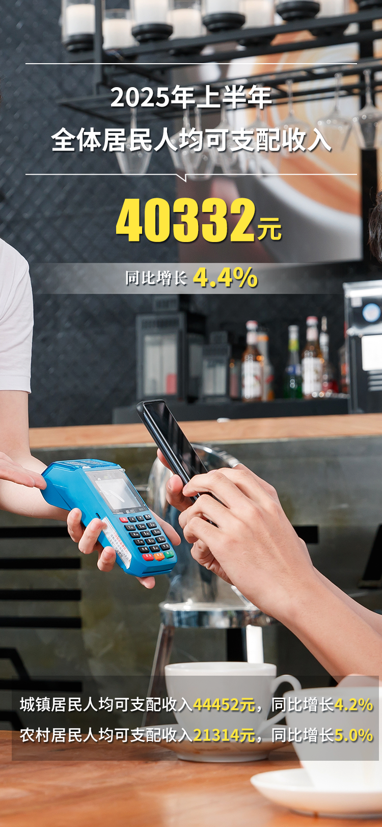 上半年,全体居民人均可支配收入40332元,同比增长4.4%,较上年同期提升0.4个百分点。按常住地分,城镇居民人均可支配收入44452元,同比增长4.2%;农村居民人均可支配收入21314元,增长5.0%。农村居民人均可支配收入增速快于城镇居民0.8个百分点,城乡居民收入比值由上年同期的2.102降至2.086。