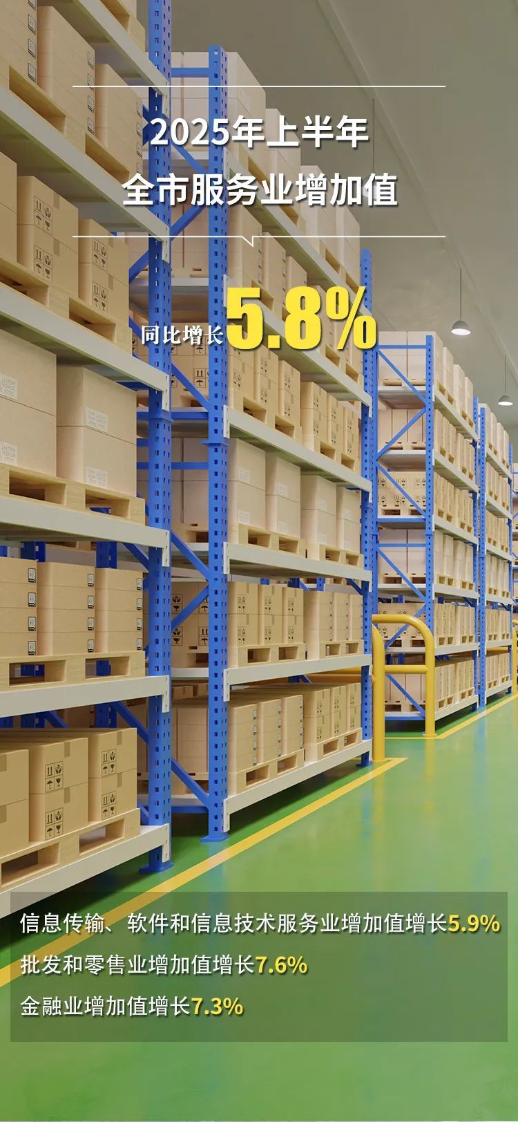 上半年,全市服务业增加值同比增长5.8%,快于地区生产总值增速0.5个百分点。其中,信息传输、软件和信息技术服务业,批发和零售业,金融业增加值分别增长5.9%、7.6%、7.3%。1—5月,全市规模以上服务业企业营业收入3512.17亿元,同比增长3.1%。现代服务业增势良好。信息传输、软件和信息技术服务业营业收入同比增长10.3%,其中互联网信息服务、互联网平台、互联网数据服务等新兴行业分别增长17.4%、28.9%、17.0%。租赁和商务服务业、科学研究和技术服务业营业收入分别增长7.6%、3.9%。文化、体育和娱乐业营业收入增长7.3%,其中受“苏超”等体育赛事带动,体育业营业收入增长19.3%。