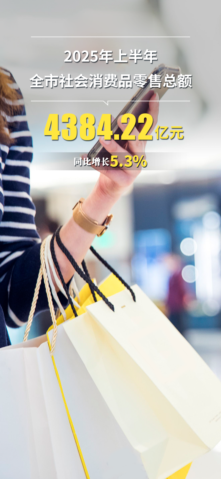 上半年,全市社会消费品零售总额4384.22亿元,同比增长5.3%。基本生活类和部分升级类商品销售增势较好,限额以上单位粮油食品类、金银珠宝类商品零售额分别增长16.2%、8.3%。“以旧换新”相关商品销售增长较快,限额以上单位家用电器和音像器材类、通讯器材类、文化办公用品类商品零售额分别增长24.1%、26.9%、27.7%。汽车消费补贴有效释放居民消费需求,新能源车渗透率进一步提升,限额以上单位新能源汽车零售额同比增长68.9%,拉动限上社会消费品零售额增长4.0个百分点。