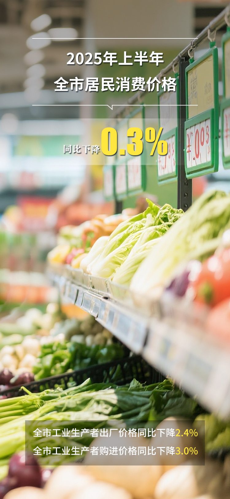 上半年,全市居民消费价格同比下降0.3%。分类别看,食品烟酒价格下降0.4%,衣着价格上涨1.7%,居住价格下降0.3%,生活用品及服务价格上涨0.3%,交通通信价格下降4.1%,教育文化娱乐价格上涨0.2%,医疗保健价格上涨0.8%,其他用品及服务价格上涨7.6%。6月份,全市居民消费价格同比下降0.1%,环比上涨0.3%。
