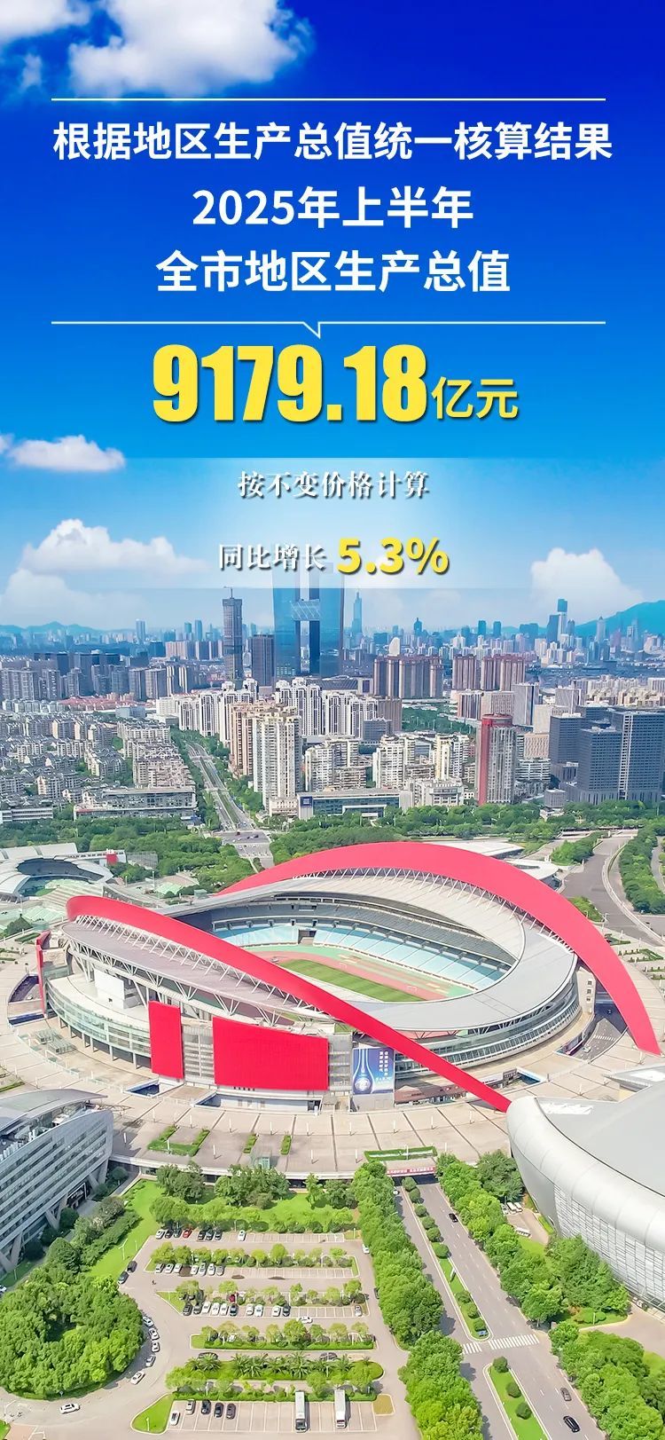 根据地区生产总值统一核算结果,上半年全市地区生产总值9179.18亿元,按不变价格计算,同比增长5.3%。分产业看,第一产业增加值106.20亿元,同比增长3.5%;第二产业增加值2851.73亿元,增长4.1%;第三产业增加值6221.25亿元,增长5.8%。