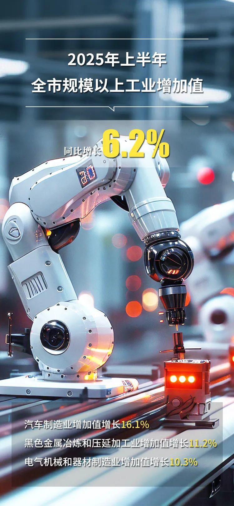 上半年,全市规模以上工业增加值同比增长6.2%。6月份,规模以上工业增加值同比增长7.6%。上半年,规模以上工业37个行业大类中有30个行业增加值同比增长,增长面达81.1%。制造业增加值同比增长6.8%,其中汽车制造业、黑色金属冶炼和压延加工业、电气机械和器材制造业分别增长16.1%、11.2%、10.3%,石油、煤炭及其他燃料加工业、仪器仪表制造业分别增长9.1%和9.7%。绿色、智能产品产量增势较好,新能源汽车、集成电路、工业机器人产量分别增长45.0%、22.1%、44.2%。