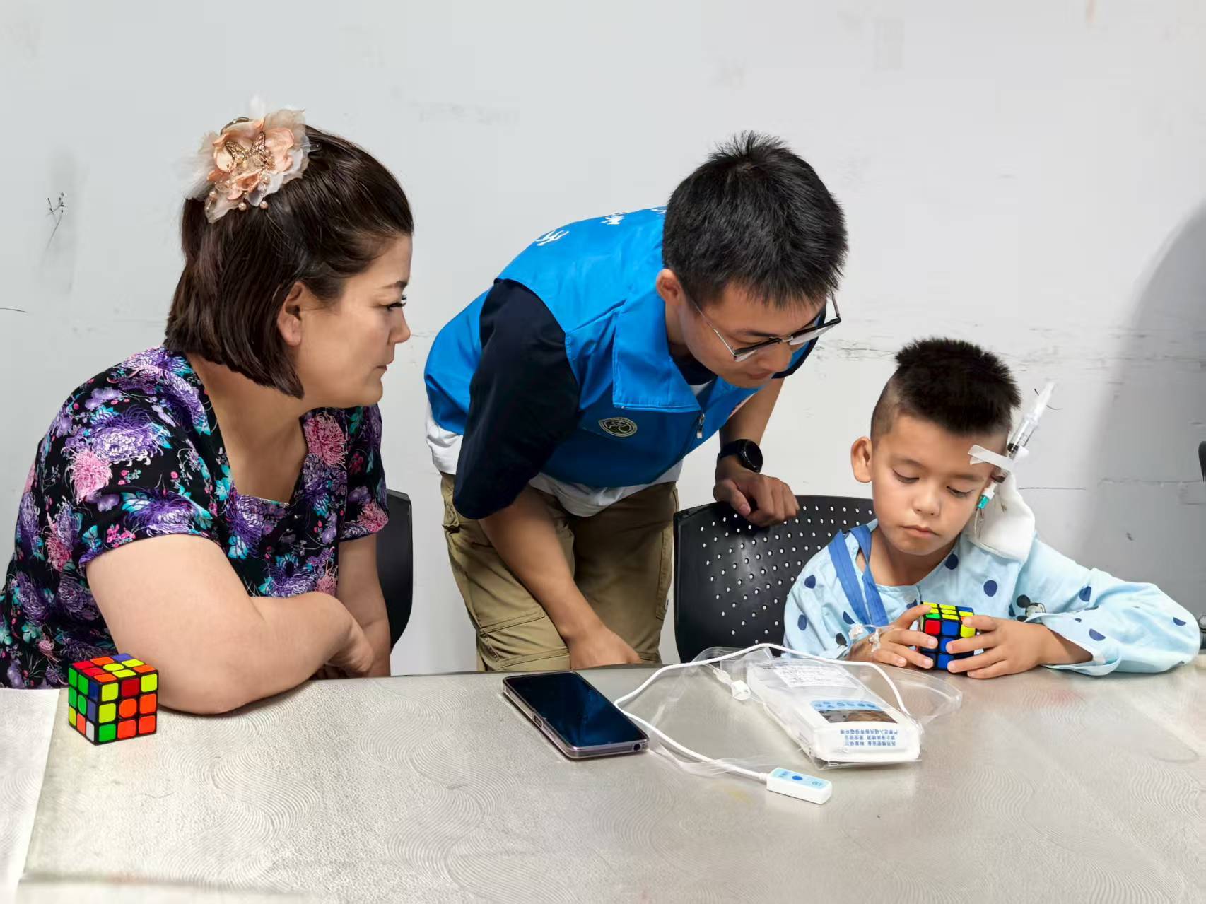 “为什么要玩魔方呢?它有什么特别之处呀?”第二节魔方拼图课程开课啦!孩子们拿起桌上的魔方,跟着志愿者吴恩琦认真学习基本知识和常用手法,孩子们小小的手指在魔方上笨拙却执着地转动着。由于初次接触魔方,伊力亚斯不时遇到小困难,志愿者和护士老师立马上前帮忙,手把手地引导。