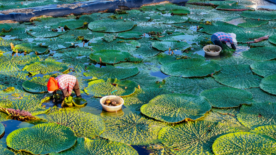 节目以“芡实”为线索,聚焦谢埭荡村独特的绿色产业发展与乡村建设实践。镜头记录了嘉宾们深入芡实园亲手采剥新鲜芡实,在村民讲解下了解谢埭荡村芡实业的发展历程。