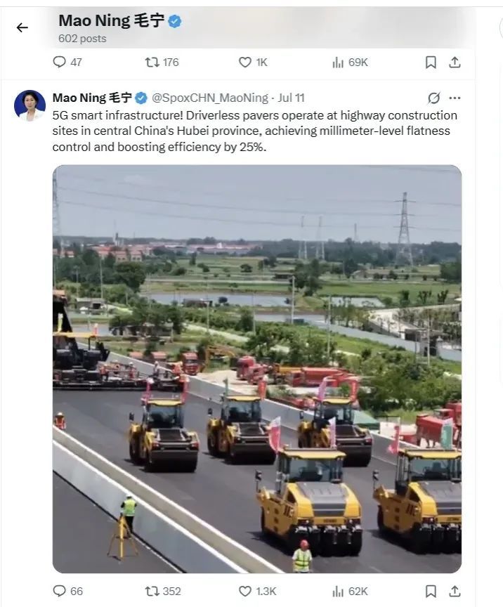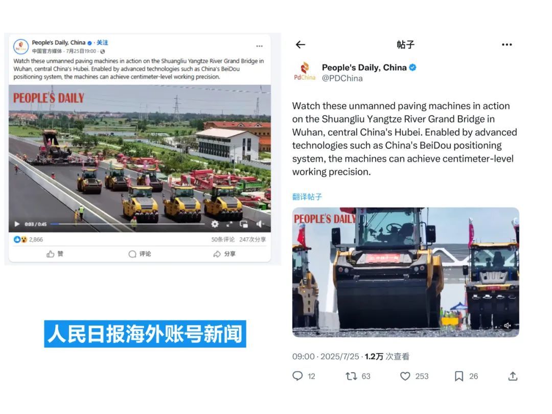 近日,中国外交部新闻司司长、发言人毛宁关注到双柳长江大桥的路面施工项目,在海外社交媒体平台上发表该项目的徐工无人驾驶作业成果,将其作为中国高质量发展和科技进步的生动例证向世界推介。