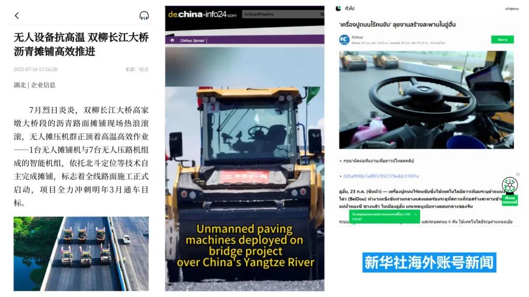 新华社以英、德、泰等多语种向全球观众呈现双柳长江大桥的无人驾驶作业,展现中国智能建造的硬实力;