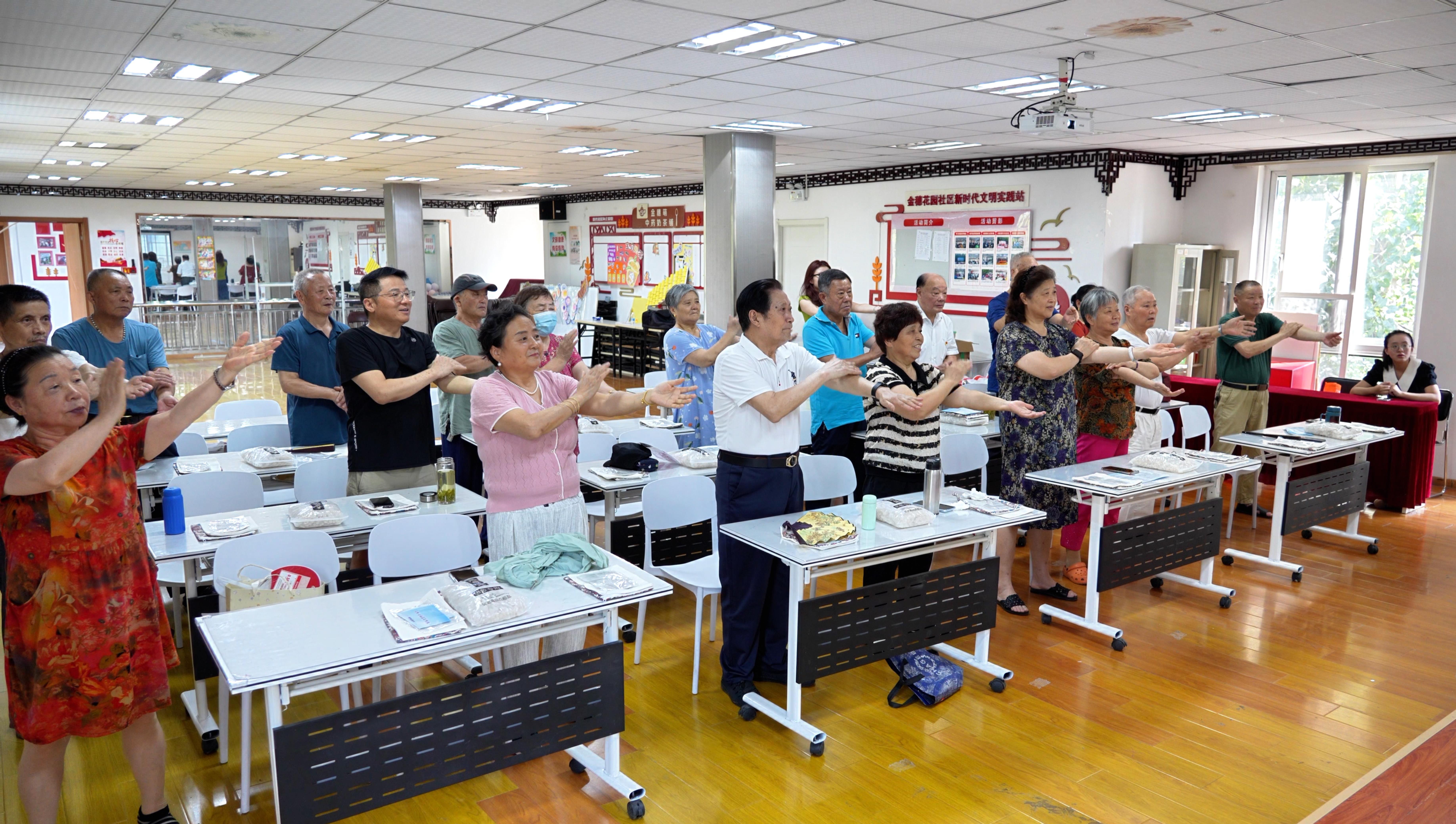 “拍肩窝、揉肘窝,跟着节奏动起来!”8 月 6 日上午,建邺区沙洲街道金穗花园社区活动室里笑语喧天。随着“拍八虚”养生操的音乐响起,老人们跟着工作人员的示范抬手、拍肩、揉肘,“红领颐养・金暖耆年”红领金主题活动就此热闹拉开序幕。
