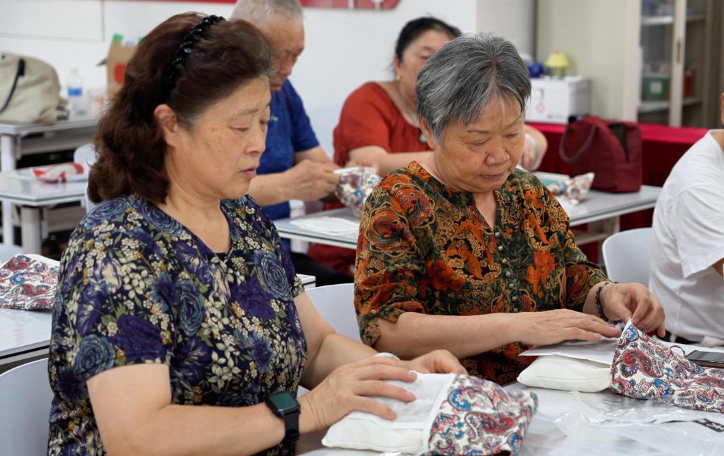 养生手作环节,老人们兴致高昂,将海盐及搭配的中药材料一一选配放进布袋里,过程中大家时不时交流不同中药材料的味道和功效,选择适合自己的材料,志愿者同步讲解海盐包热敷的注意事项,没过多久,一个个饱满实用的热敷包就完成了。