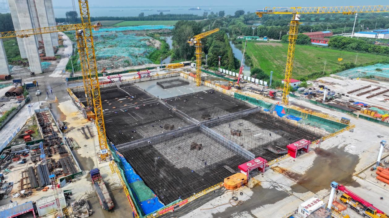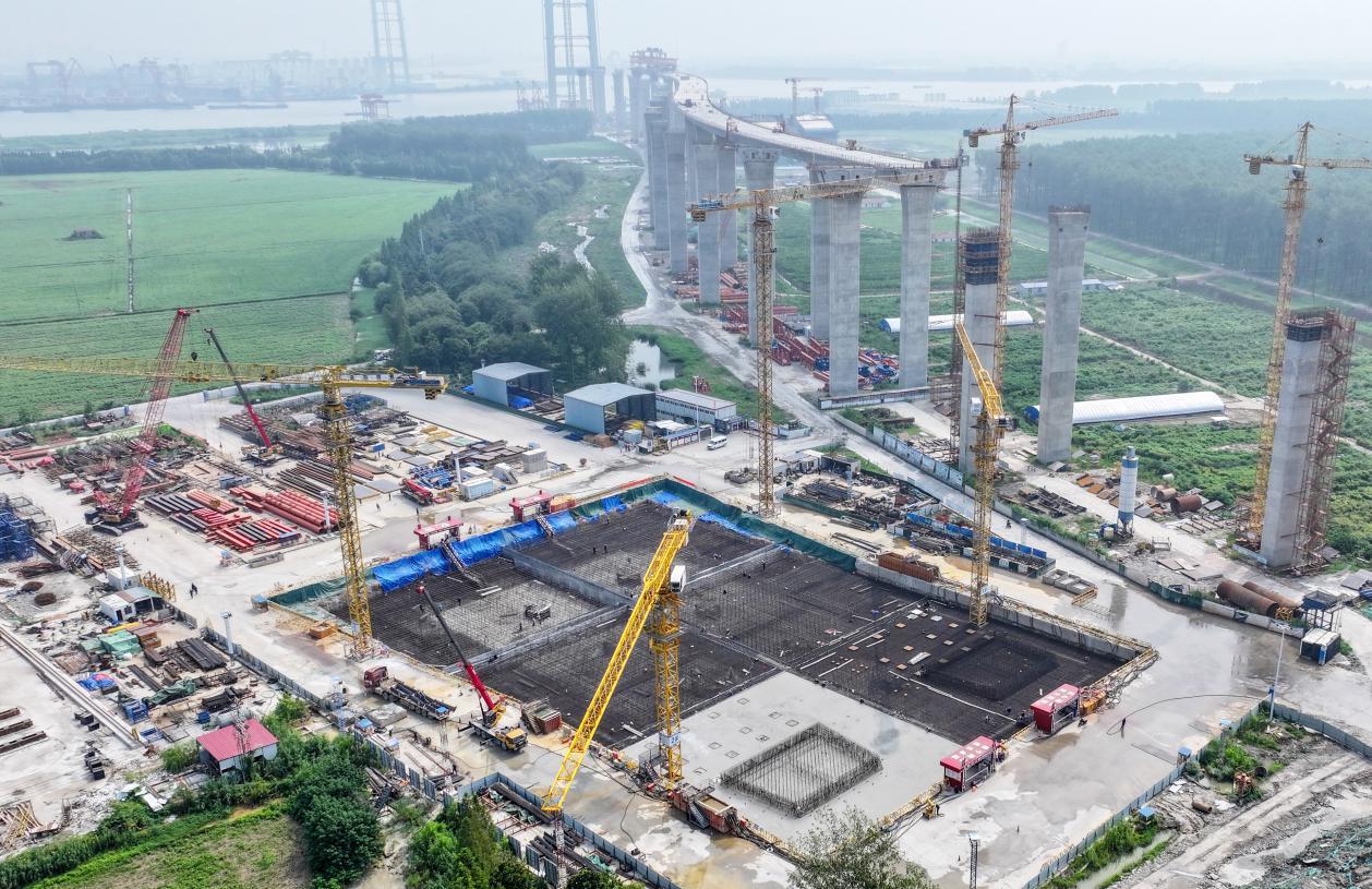 作为大桥承受主缆拉力的“心脏”,锚碇的重要性不言而喻。张靖皋长江大桥北锚碇选址靖江马洲岛,这个世界在建最大锚碇基础采用支护桩结构复合地连墙形式,施工面积相当于15个标准篮球场,建成后将成为世界最大体积地连墙锚碇基础。“它是全桥的‘关键工程’,承载着上部结构14万吨的锚固力,直接关系全桥建设进度,每一道工序都不能含糊。”中铁大桥局集团张靖皋长江大桥ZJG-A2标项目部工程部技术骨干林梓胜指着正在施工的区域介绍,顶板完工后将转入地面以上的锚块施工,整个北锚碇工程预计明年年中完成。