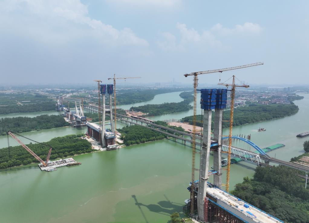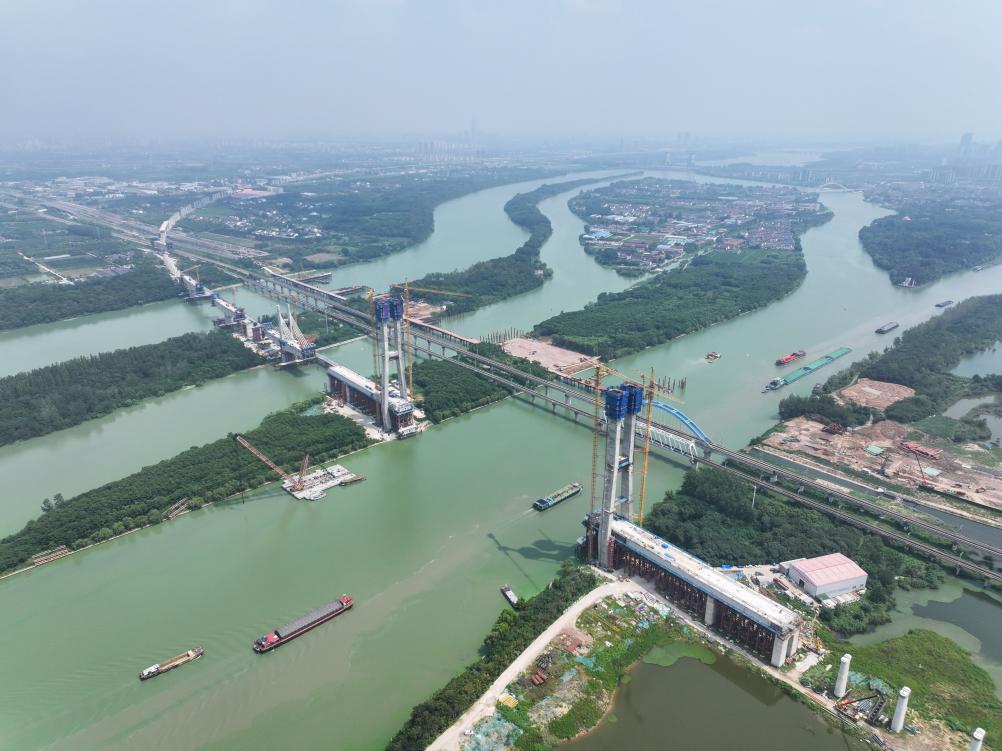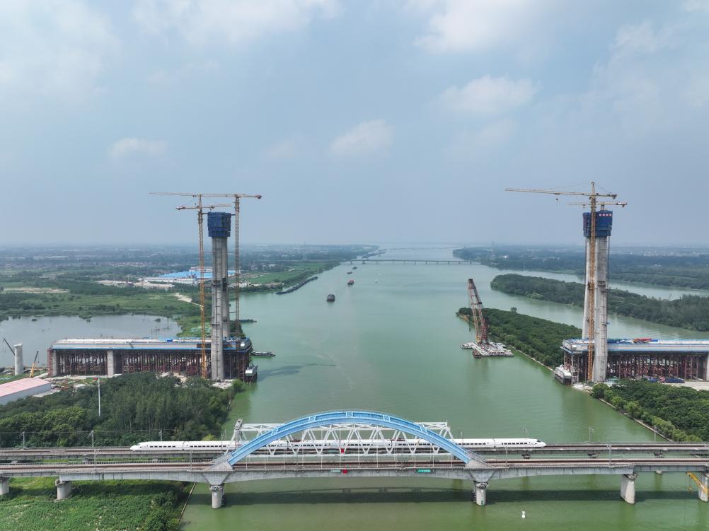 这是8月5日拍摄的沪渝蓉高铁跨京杭运河斜拉桥建设现场(无人机照片)。