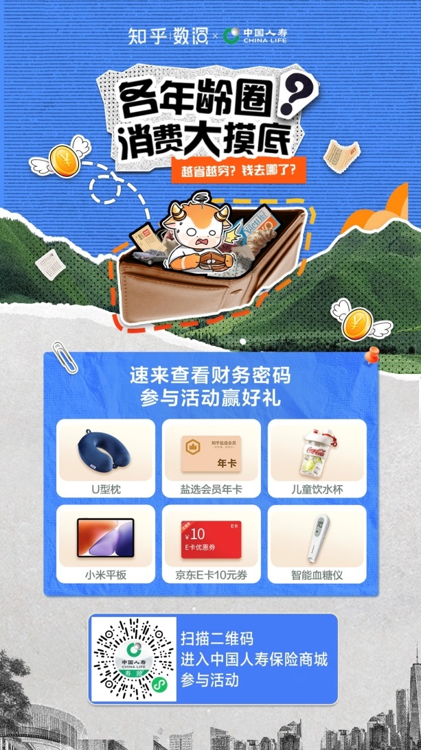 近日,中国人寿保险股份有限公司(以下简称“中国人寿”,股票代码:601628.SH,2628.HK)携手知乎“数洞”实验室、每日人物共同发起“各年龄圈消费大摸底”线上调研行动。活动通过收集1000个普通网友的真实账单,揭开不同代际人群的财富流动图谱,为公众奉上一份新鲜的“消费报告”。