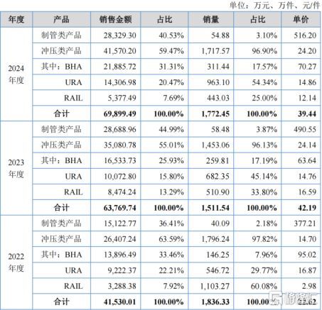 2022年、2023年和2024年(简称“报告期”),公司冲压类产品的营收占比均为55%以上,制管类产品的营收占比均为36%以上。