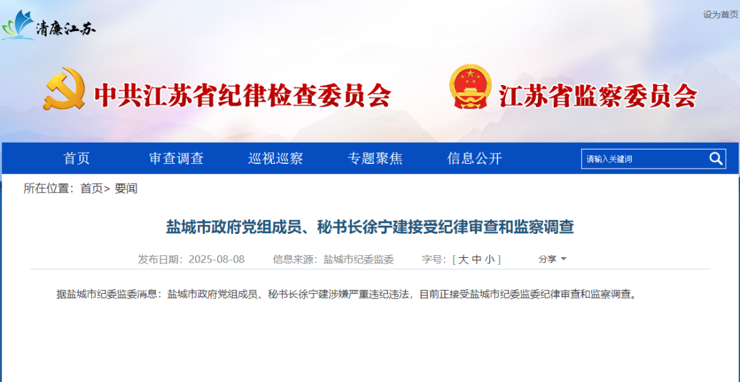据江苏省纪委监委官方网站8月8日援引盐城市纪委监委消息:盐城市政府党组成员、秘书长徐宁建涉嫌严重违纪违法,目前正接受盐城市纪委监委纪律审查和监察调查。