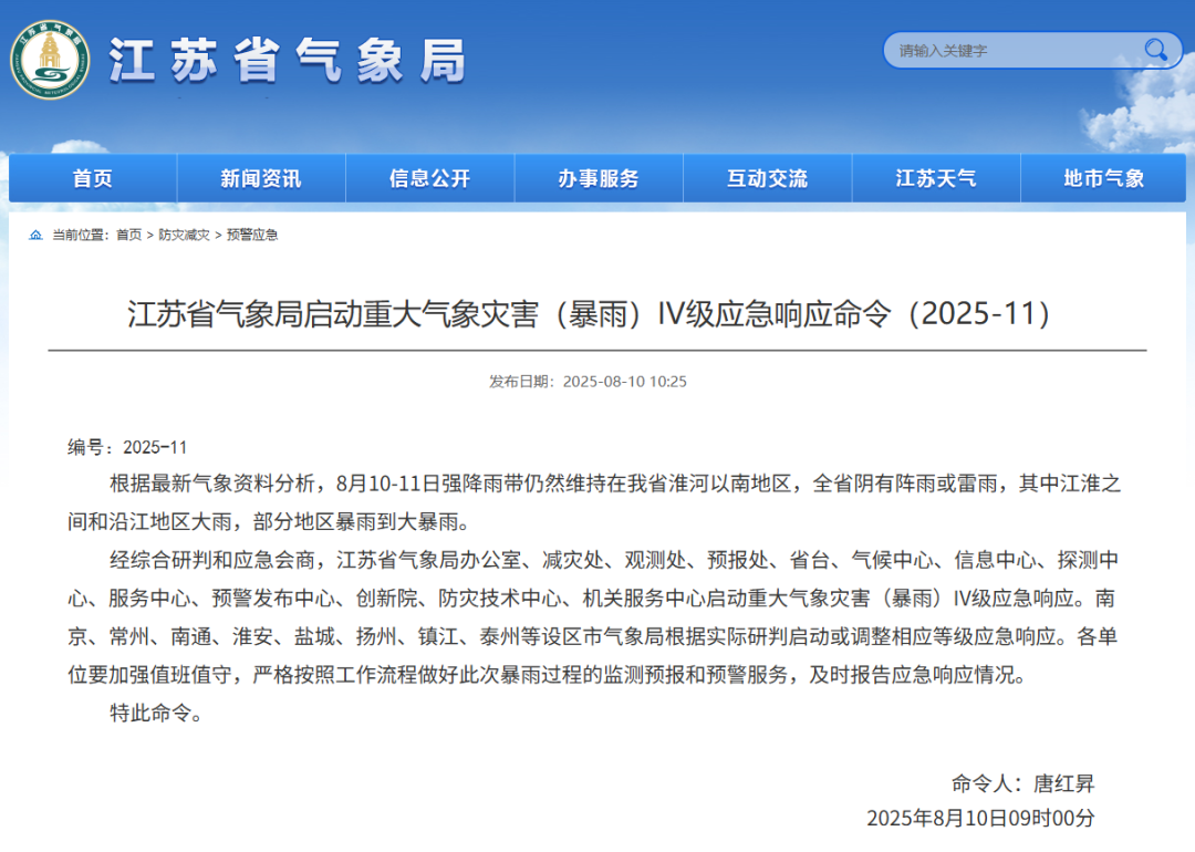 8月10日,江苏省气象局发布启动重大气象灾害(暴雨)IV级应急响应命令: