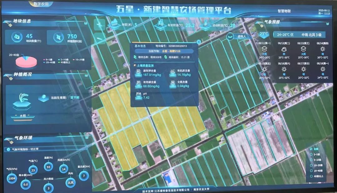 在盐城市亭湖区盐东镇的五星・新建粮食生产综合服务中心,一块巨大的电子屏犹如农田的“智慧大脑”,实时显示土壤墒情、作物长势、气象预警等关键数据。“足不出户,农田动态尽在掌握。”该中心负责人严超介绍,依托田间的农情传感网络和物联网技术,这里构建了农田信息立体感知系统,对生产全要素进行实时监测分析。