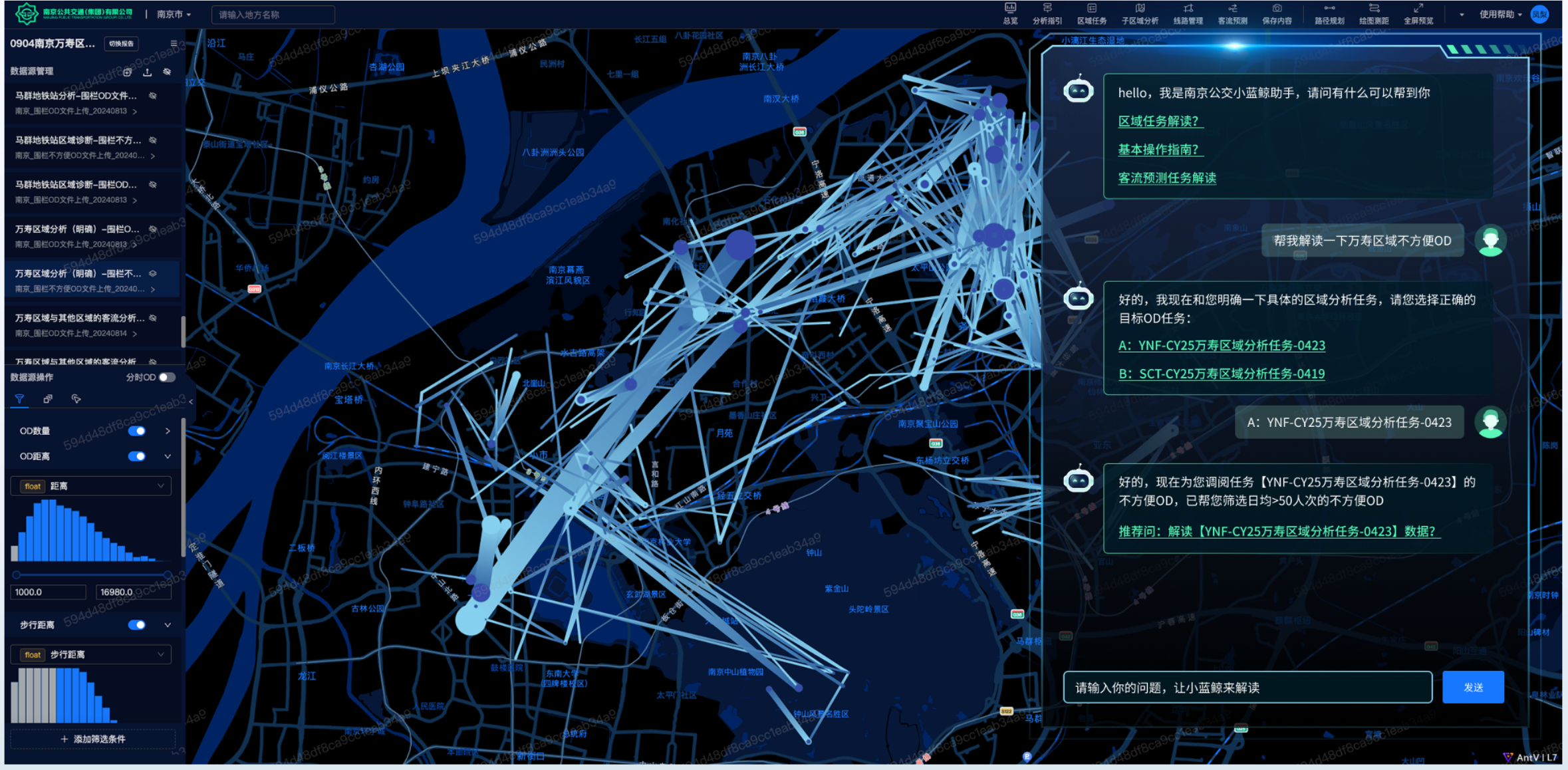 据了解,自2022年起,南京公交就启动运营调度系统智能化升级,2025年南京公交与蚂蚁数科共建的“线网优化与客流预测AI大模型”(以下简称“小蓝鲸”)取得阶段性成果。小蓝鲸可智能分析“出发点到终点”各条线路时长,精准刻画全城、全时段、全方式出行图谱;可以精准解析200m内地铁站、公交站、社区枢纽的客流规律,捕捉出行“毛细血管堵塞点”,智能生成接驳线路最优解。