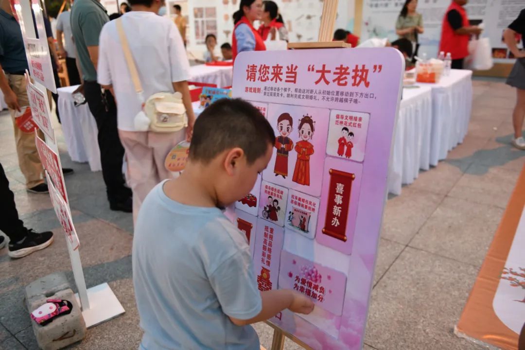 现场还设置了丰富的互动环节。移风易俗飞行棋大闯关让大家在掷骰子、走步数中学习文明知识;“请您来当‘大老执’”模拟场景互动,让群众亲身参与婚事新办、丧事简办的流程设计;移风易俗知识有奖问答更是掀起小高潮,大家踊跃抢答,将“文明养犬”“绿色交通低碳出行”“孝老爱亲、勤俭节约”“光盘行动” 等理念牢记心间。