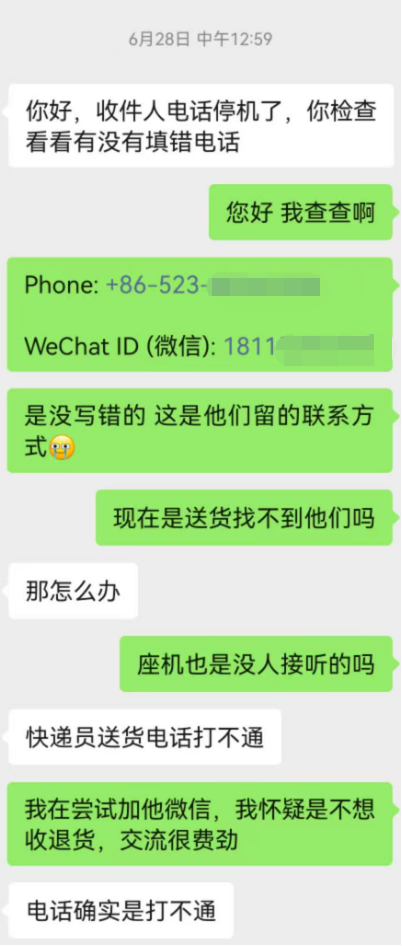 孙女士表示,其自付3913元运费选择退货,但商家提供了错误地址,导致京东快递多次派送失败,订单在被商家(老板)的妈妈签收了以后,PayPal平台显示“未收货”。根据系统规则,PayPal因识别未按指定地址退货,视为未遵循平台退货流程,导致孙女士申诉败诉。商家以“已支付高额国际运费”为由,坚持扣除部分运费后,仅愿意退还50%的货款(约400欧元)。孙女士要求全额退款(含3913元运费)的诉求未获回应。孙女士表示,目前商家拒接电话,并拉黑微信,也无视邮件沟通,总计10613元的商品费与退货运费仍由她承担着。