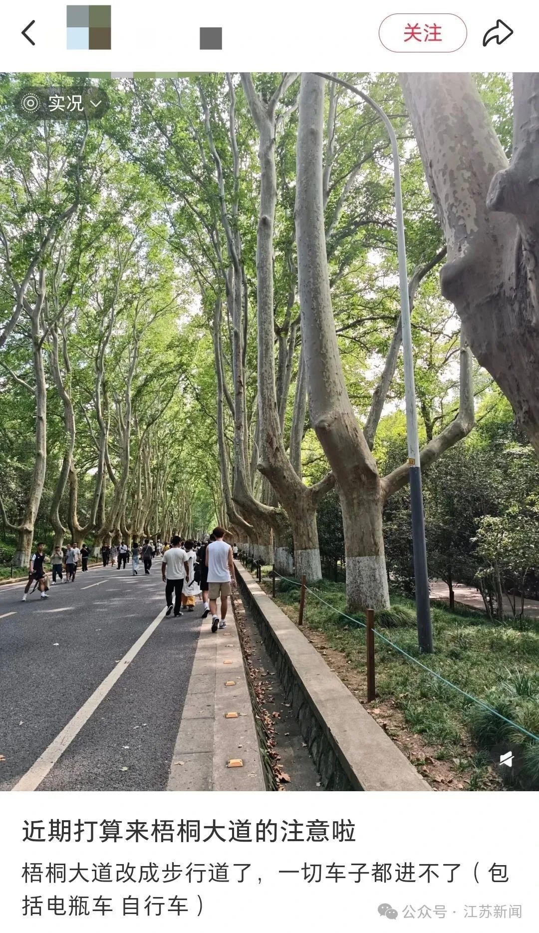 近日,有网友在社交媒体发帖称,南京钟山风景区梧桐大道部分路段拟调整为步行街,只允许行人通行。