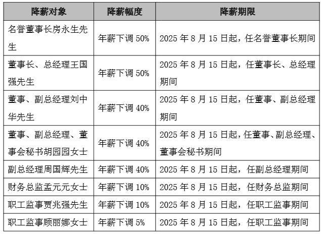 公告显示,名誉董事长房永生及董事长、总经理王国强年薪下调50%;董事、副总经理刘中华,董事、副总经理、董事会秘书胡园园,副总经理周国辉年薪下调40%;财务总监孟元元、职工监事贾兆强年薪下调10%;职工监事顾丽娜年薪下调5%。