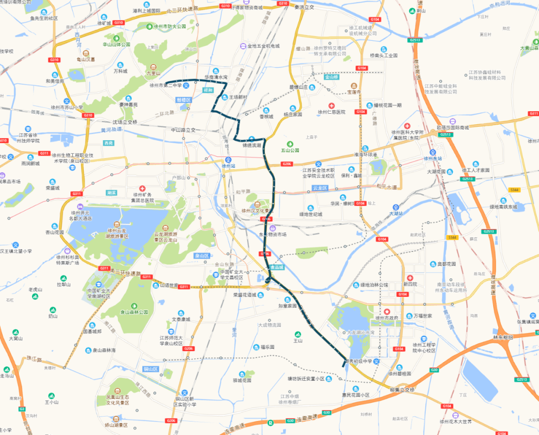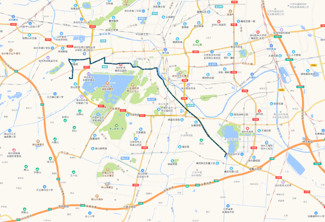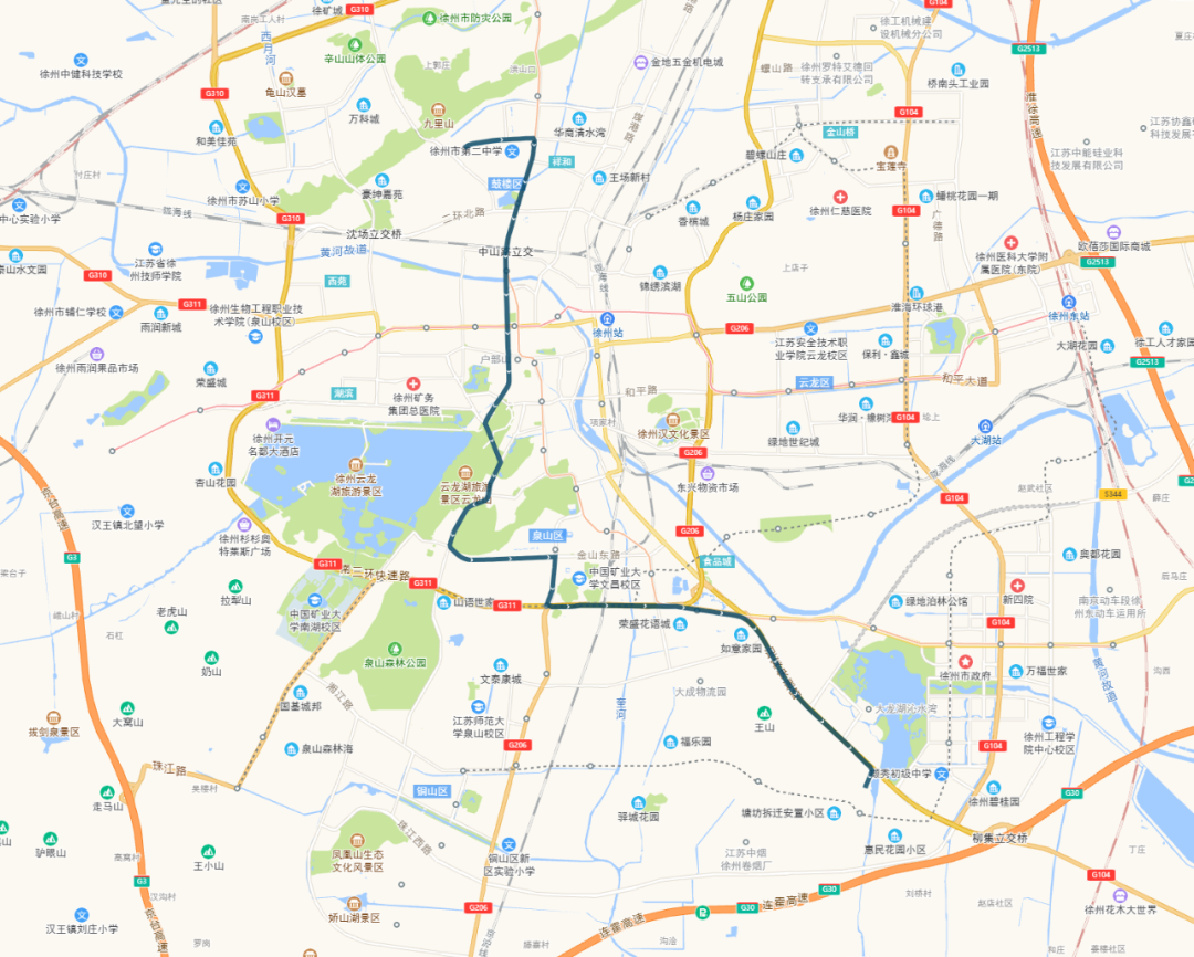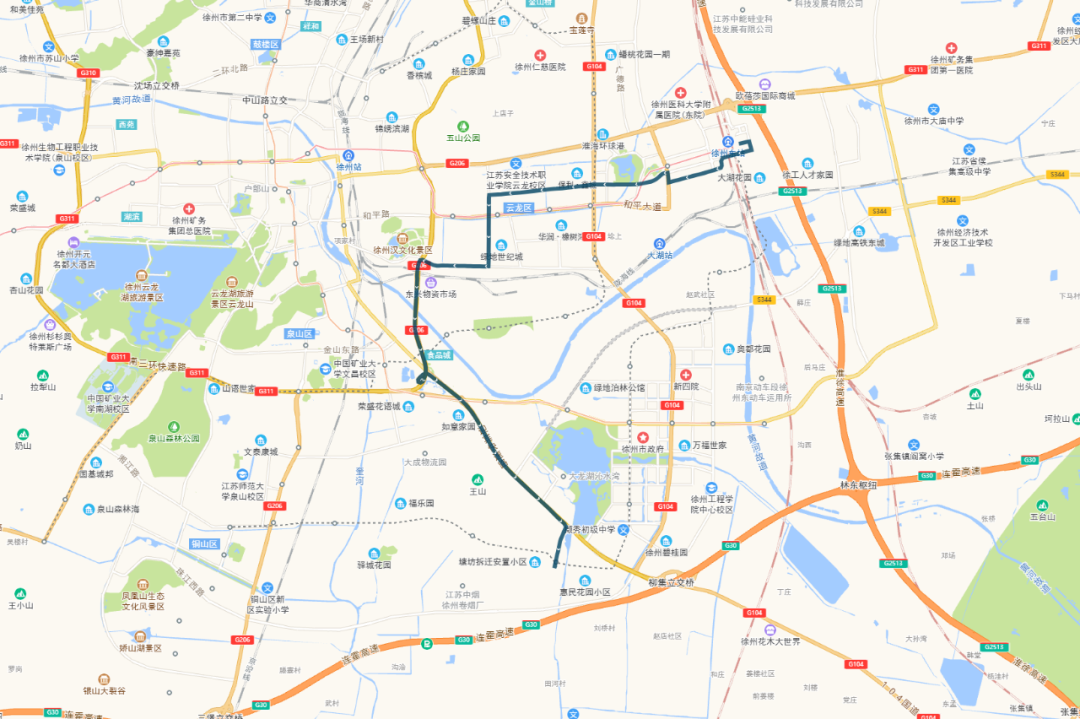 徐州市中医院—山南小镇:徐州市中医院、响山、二七宿舍、白云山、堤北市场、堤北农贸市场、电力医院、奔腾大道东口、祥和四季花园、华厦水云间、奔腾大道路口、鼓楼生态园南、山南小镇。