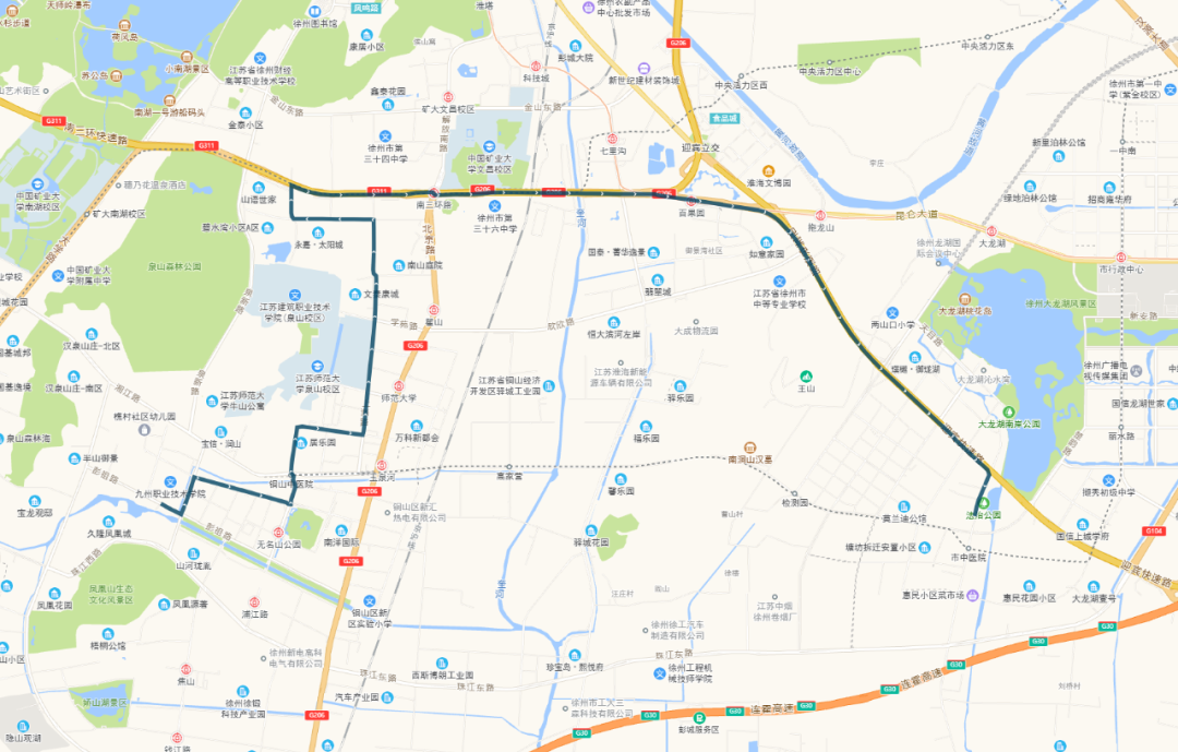 徐州市中医院—山南小镇:徐州市中医院、御景湾小区、三环南路(长安路)、矿大南门、矿业大学、大学城、泰山汇景花园、孟庄公寓、营房东门、徐州图书馆、泉山检察院、中医院、中山饭店、交通银行、中山南路(中枢街)、金地商都、北路口、鼓楼广场、鼓楼区政府、马场村(中山北路)、奔腾大道地铁站、鼓楼生态园、华美生态园、山南小镇。