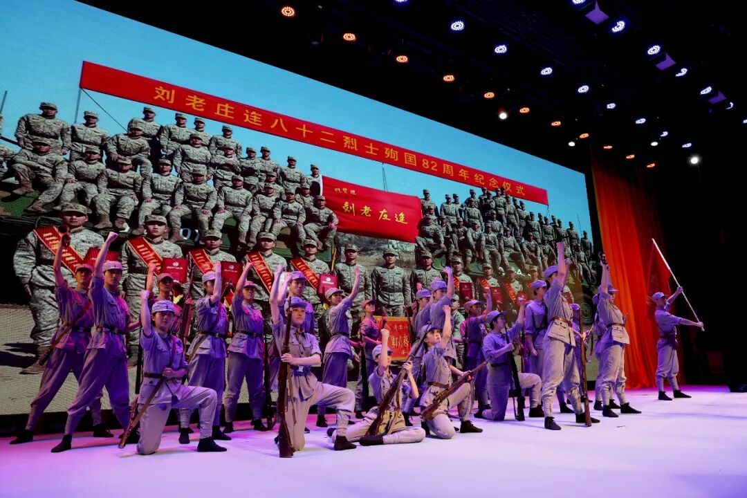 舞台上的红色叙事缓缓拉开。“烽火初燃,军民同心!”《白菜心》《保卫郭村》等歌曲铿锵响起。演员们以合唱、情景剧、舞蹈等多元形式,再现新四军战士持枪冲锋、百姓推车支前的场景。舞台背景中,奔袭、冲锋等画面通过全息投影跃然眼前,枪炮声、呐喊声与旋律交织,令观众仿佛置身历史现场。