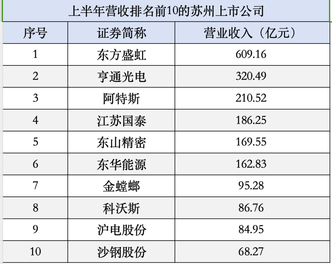 今年上半年营业收入超过500亿元的苏州上市公司为1家,超过100亿元的共有6家,超过10亿元的共有82家,超过1亿元的共有219家。