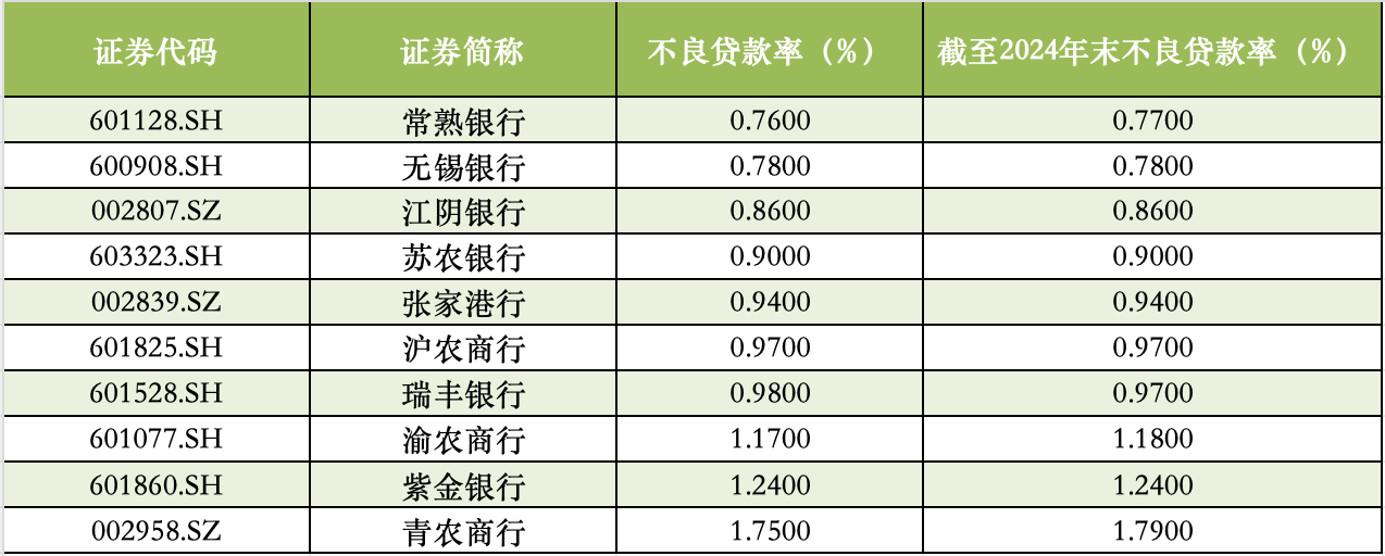 从资产质量看,截至2025年6月末,有7家A股上市农商行不良贷款率低于1%。其中,常熟银行、无锡银行、江阴银行不良贷款率低于0.9%,分别为0.76%、0.78%、0.86%,苏农银行、张家港行、瑞丰银行、沪农商行不良贷款率均处于0.9%-1%之间。