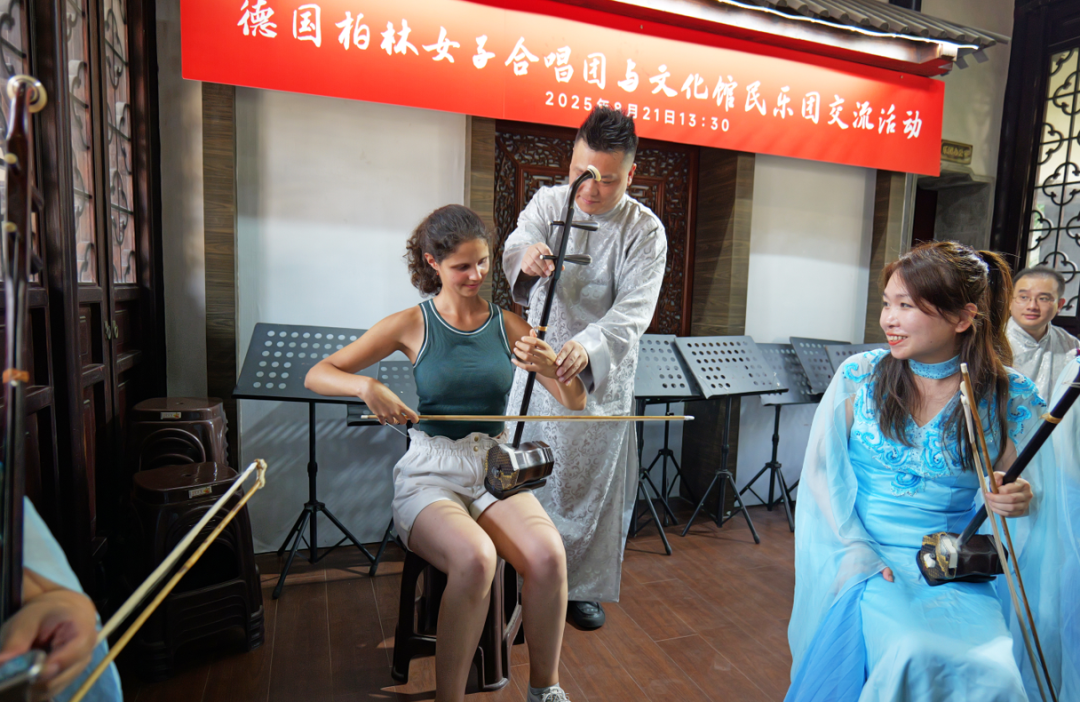 而城市的另一头——在古色古香的太仓江南丝竹馆,柏林女子合唱团的成员们在江南丝竹的伴奏下,现场唱响了江苏民歌《茉莉花》。尽管是第一次接触江南丝竹,许多德国艺术家表现出极大兴趣,在模仿与尝试中体会中国文化精髓。