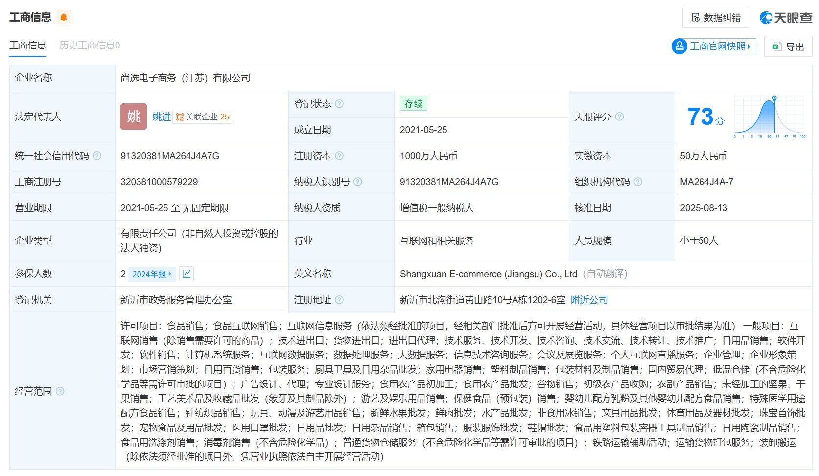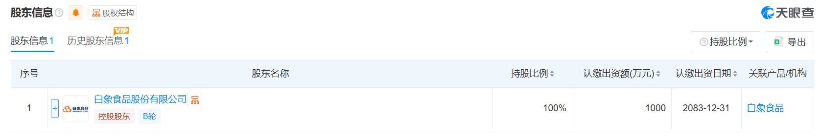 天眼查显示,尚选电子商务(江苏)有限公司成立于2021年,注册资本1000万人民币,实缴资本50万人民币,法定代表人为姚进,由白象食品股份有限公司全资持股。
