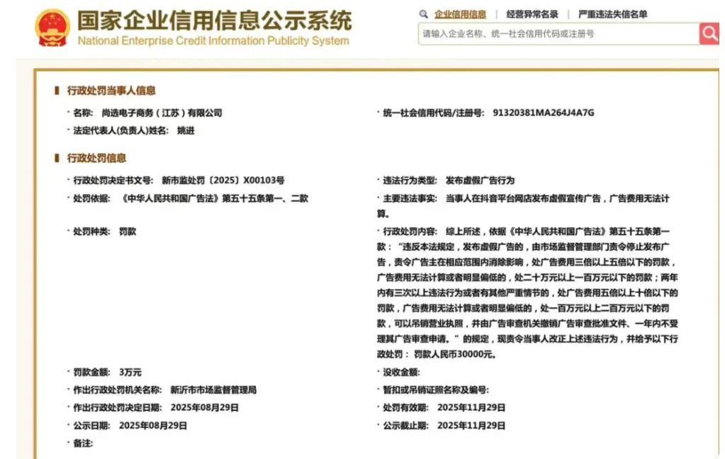 9月5日消息,国家企业信用信息公示系统网站显示,近日,尚选电子商务(江苏)有限公司因发布虚假广告,被新沂市市场监督管理局罚款3万元。