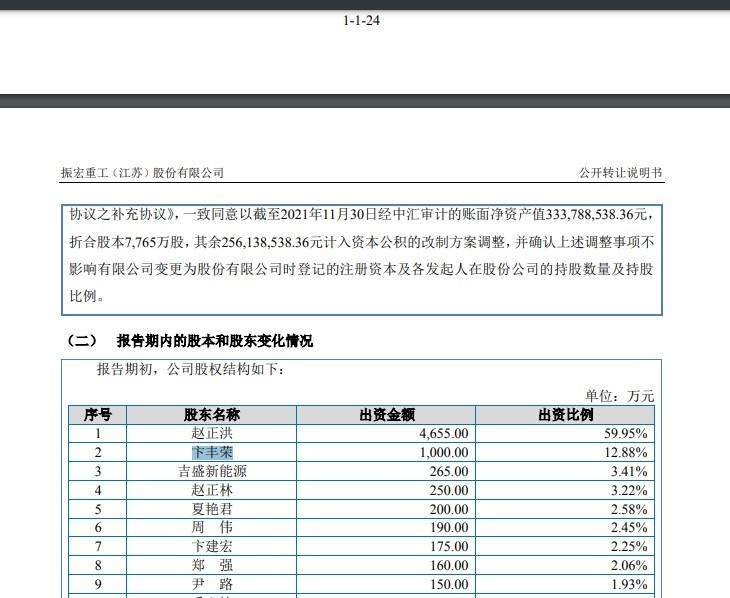 根据振宏股份新三板挂牌时期披露的公开转让说明书,2022年初,卞丰荣持有振宏股份12.88%的股权。而据公司今年的招股书(申报稿),卞丰荣持有振宏股份的股权比例已降至3.81%。