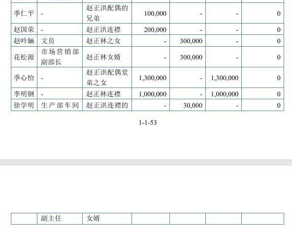 例如,赵正林之女赵吟婳担任公司文员,赵正林女婿花松源任市场营销部副部长,两人分别间接持有公司30万股。又如,赵正洪配偶的堂弟之女季心怡直接持有公司130万股,赵正林连襟李明钢直接持有公司100万股,赵正洪连襟的女婿徐学明担任生产部车间副主任。