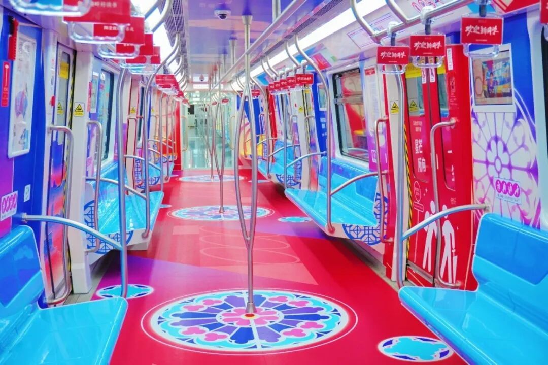 抬头是模拟星河的灯箱,仿佛缀满苏大未来的星光;两侧车门印着苏州地标与苏大建筑的插画,车门开合间,宛如穿梭于千年古城与百廿学府之间;脚下的地板以扶手为中心,复现了本科生录取通知书里的苏大彩窗图案,每一步都似踏过“一路生花”的前程。