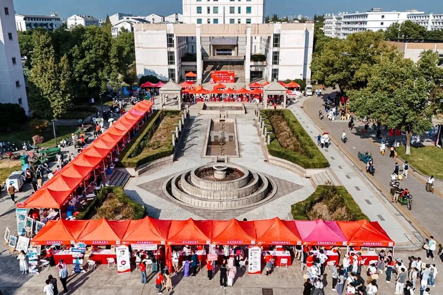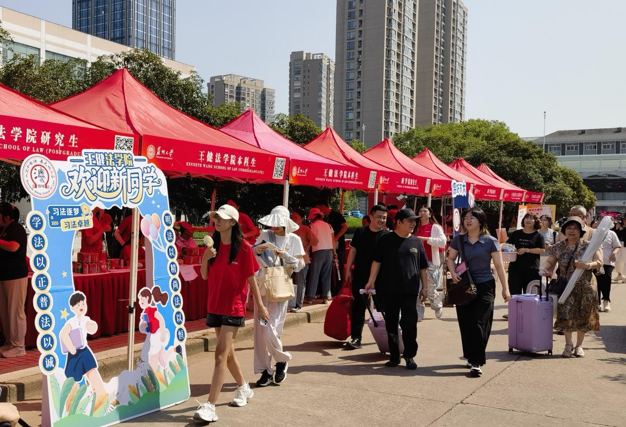 清晨六点半,苏州大学天赐庄校区的红砖建筑群裹着薄晨露,第一缕阳光掠过校门校牌时,林荫道旁的迎新摊位已响起此起彼伏的指引声,红色的“欢迎新同学”大幅背景与迎新横幅交相辉映,将校园装点得格外热闹。