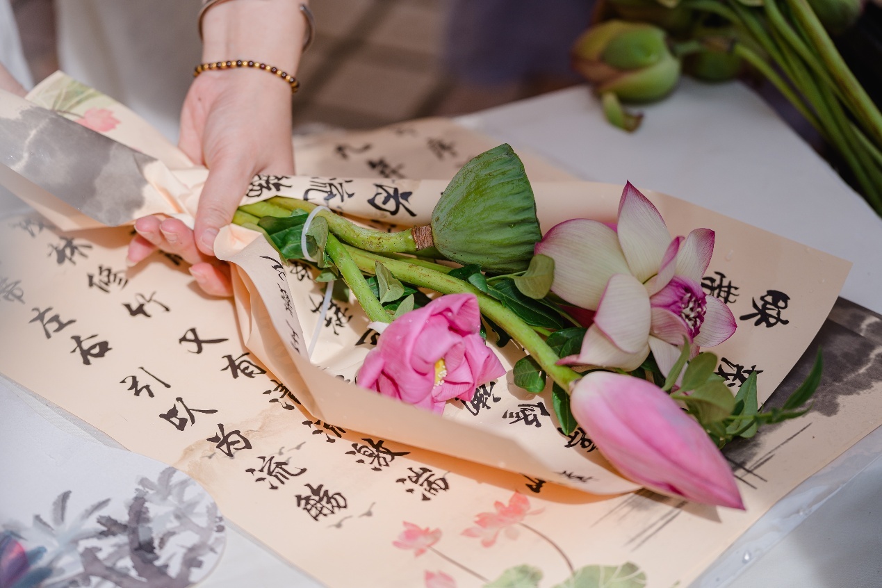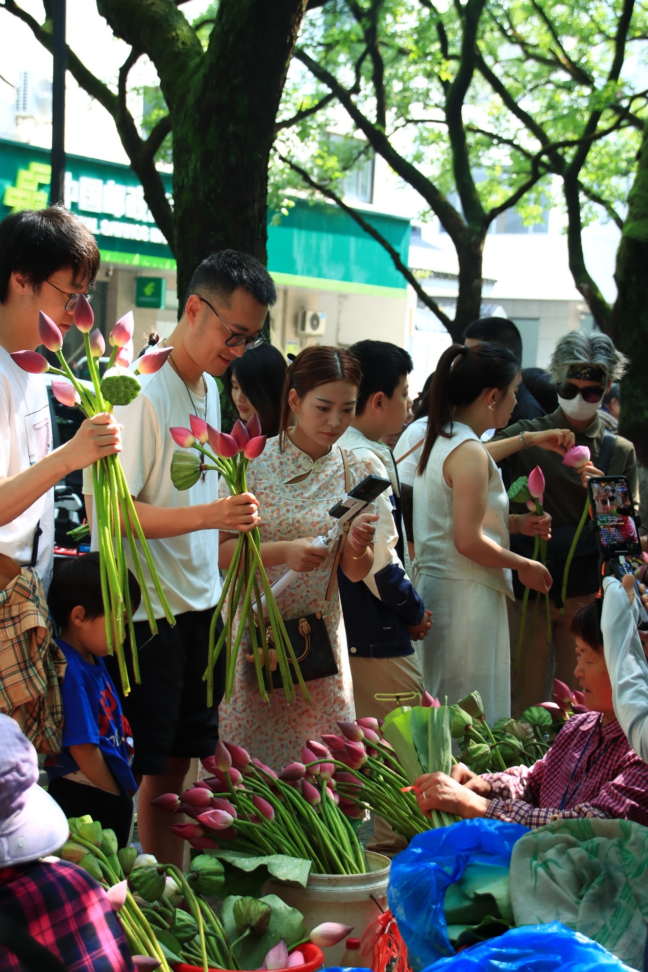 就连热闹的观前街,也随处可见手持荷花的身影——有人逛着丝绸店,将荷花放在锦缎布料旁比对色彩;有人坐在街边的茶座上,把荷花插在青瓷杯里,边喝茶边赏荷,偶尔举起手机和花束自拍,眉眼间满是笑意。