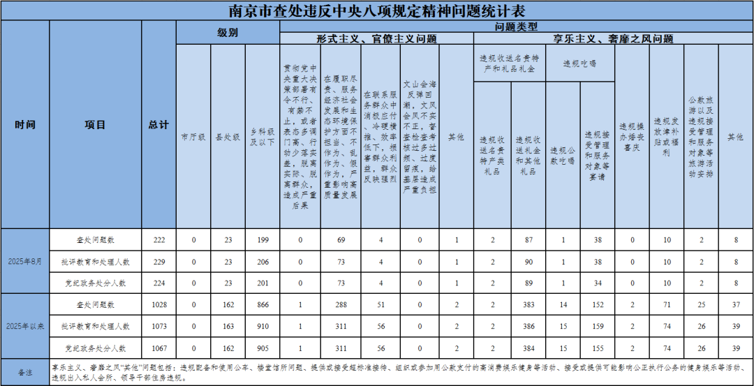 9月16日, 南京市纪委监委 通报了2025年8月全市违反中央八项规定精神问题查处情况。全市共查处违反中央八项规定精神问题222起,批评教育和处理229人,其中党纪政务处分224人,批评教育和处理县处级干部23人、乡科级及以下人员206人。具体如下: