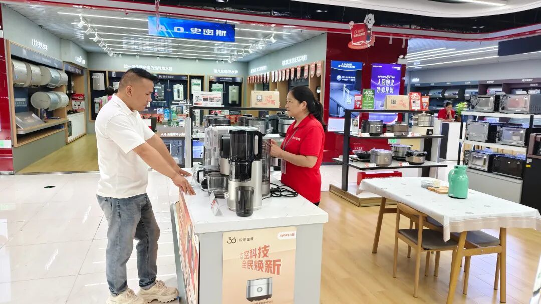 在消费品以旧换新政策推动下,邳州市补贴类商品持续热销。在京东五星电器邳州世茂店,各类补贴提示标识清晰醒目,不少市民正在选购家电。市民张先生家中正在装修,借助政策红利,他一次性购置了多件家电。