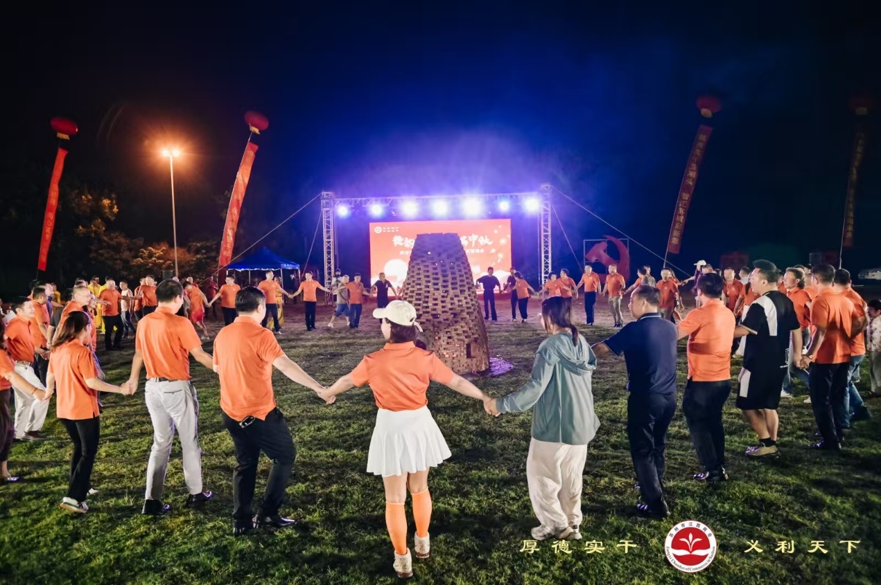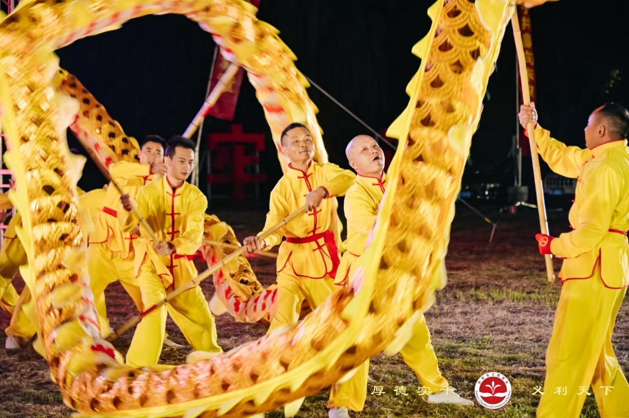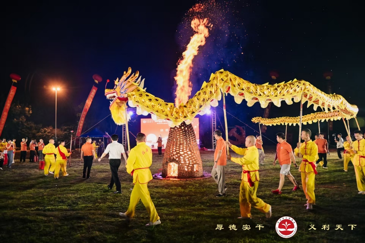 作为整场晚会的核心环节,两项源自江西的国家级非物质文化遗产——“中秋烧塔”与“舞龙”表演依次隆重呈现。在庄重的“祭月”“拜月”仪式中,会长胡策昱与荣誉会长杜康、监事长曾德利、党支部书记韩斌、轮值会长金智辉、叶茂晨共同点燃象征吉祥与希望的塔火。熊熊火焰照亮夜空,寄托着赣商对美好未来的共同愿景。随后,来自江西的专业舞龙队献上气势恢宏的绕塔表演,龙姿矫健,穿梭翻腾,展现出赣商团结拼搏、奋发向上的精神风貌。