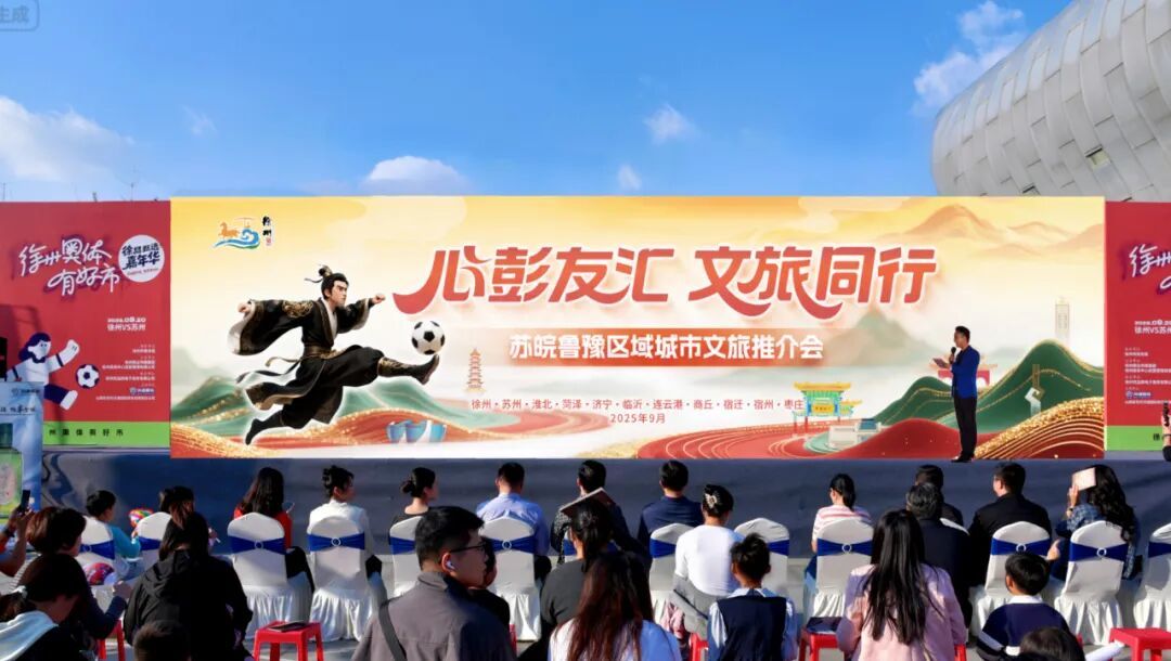 当天,由淮北、菏泽、济宁、临沂、连云港、商丘、宿迁、宿州、枣庄、苏州及徐州共11个城市文旅部门联合举办的“心彭友汇 文旅同行”苏皖鲁豫区域城市文旅推介会,在徐州奥体中心南门举行。