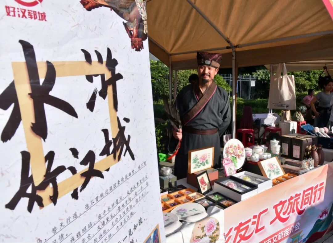 在临沂市文旅局展位前,沂蒙布艺尽显地方手工技艺,银杏茶体现本地物产特色,通过实物展示,让现场群众直观感受沂蒙大地的独特文旅风情;