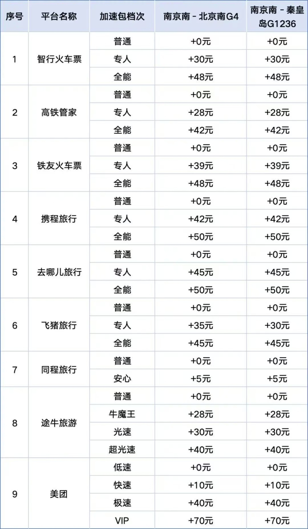 体验调查发现,针对南京南-北京南G4、南京南-秦皇岛G1236两条线路,各平台加速包的费用差异显著,单人次从同程旅行(安心抢票费用)最低5元至美团(VIP抢票费用)最高70元,多数在30至50元,且同一平台内价格越高的加速服务显示成功率越高。