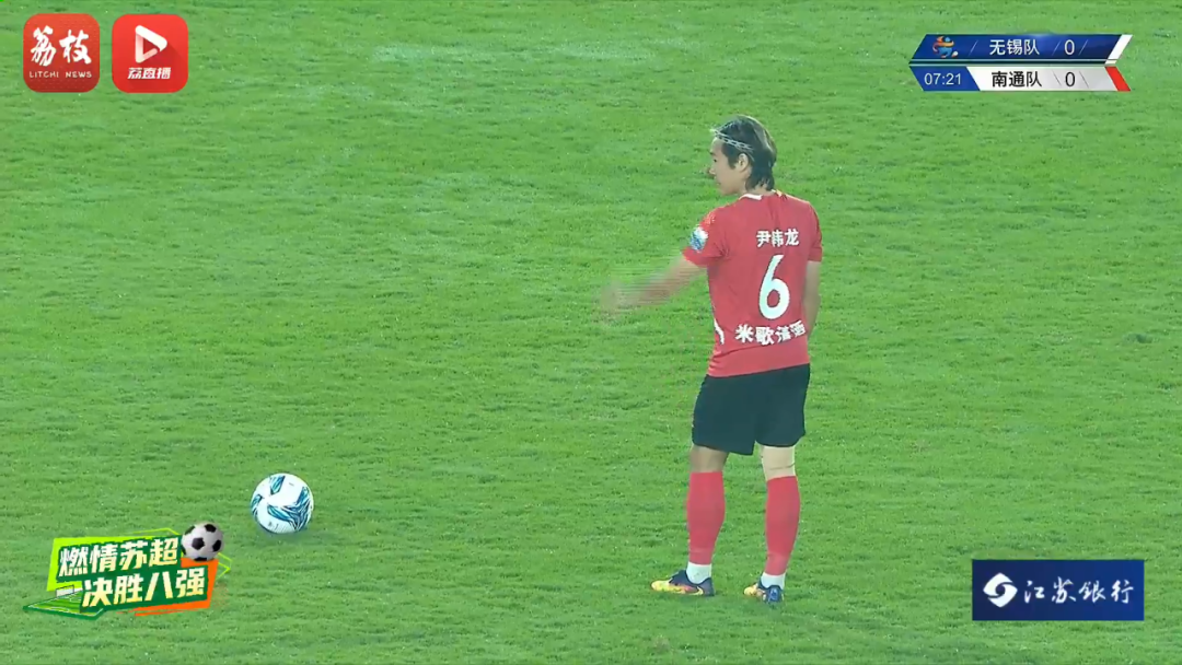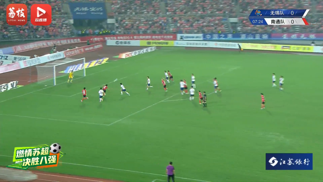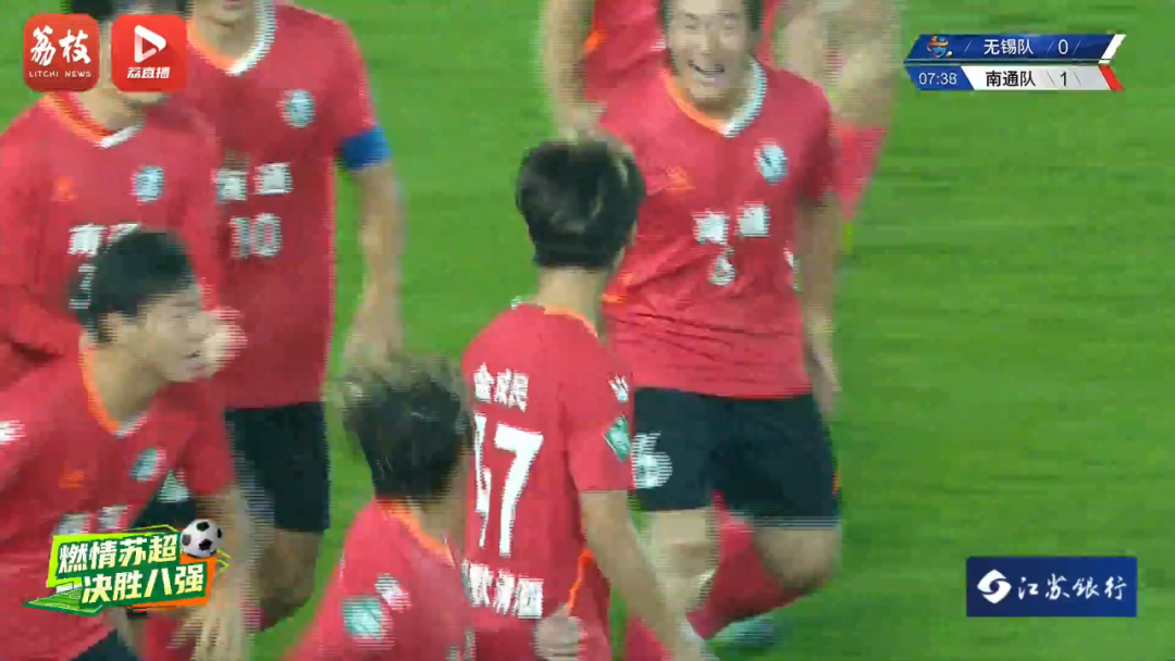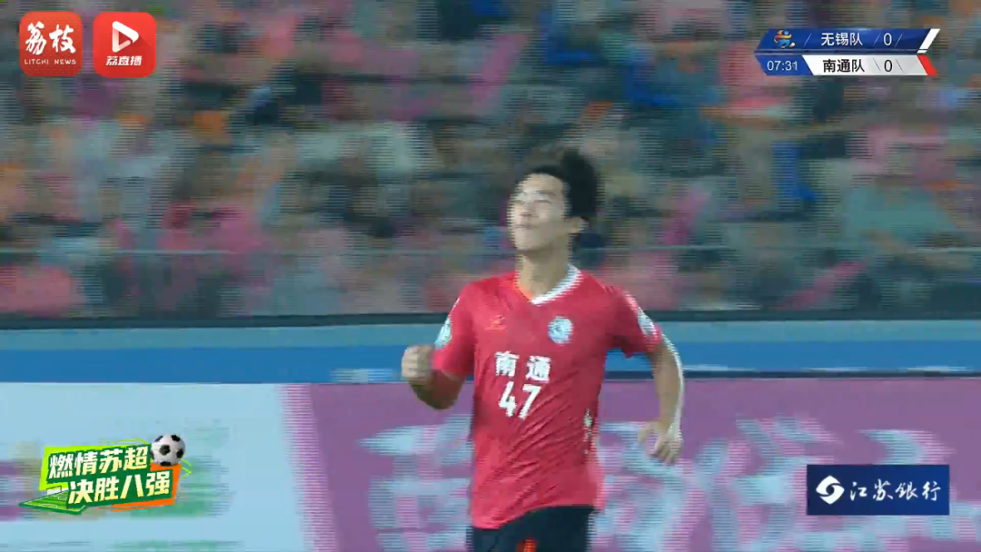 9月27日晚,“苏超”积分赛收官之战无锡队VS南通队的比赛中,开场7分半,南通队47号球员金成民攻入一球,助南通队取得领先优势,无锡0:1暂时落后。