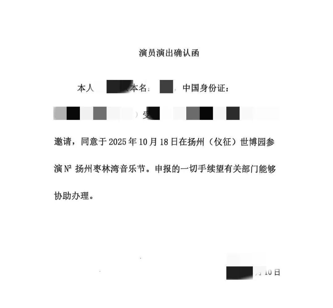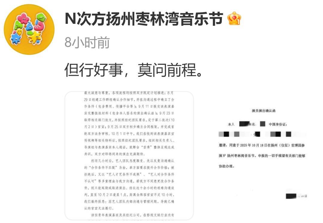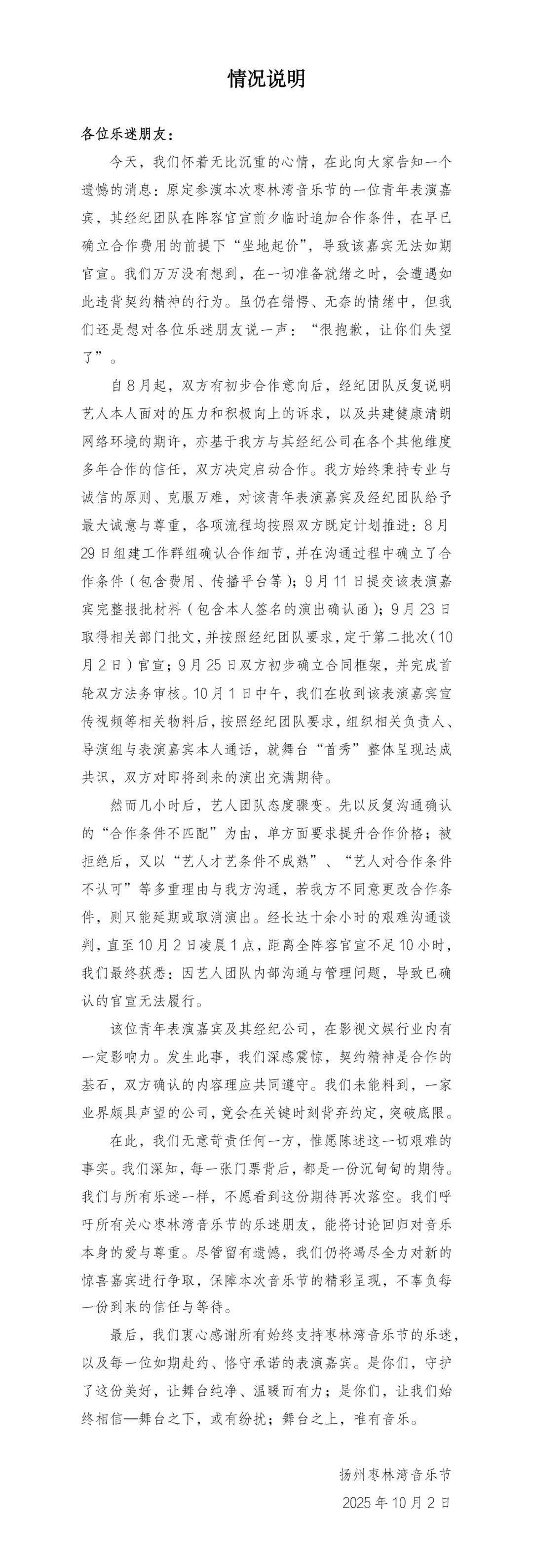 10月2日,@N次方扬州枣林湾音乐节 发布情况说明,称原定参演音乐节的青年表演嘉宾经纪团队在阵容官宣前临时追加合作条件、在已确立合作费用的前提下“坐地起价”,导致无法官宣。