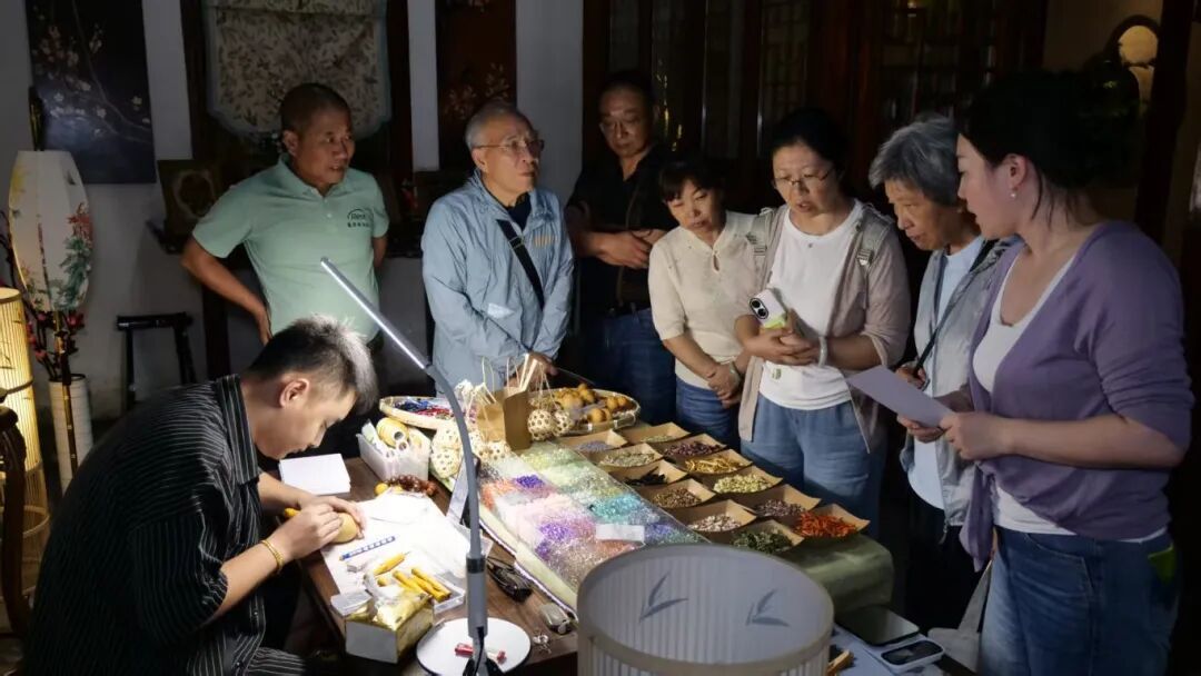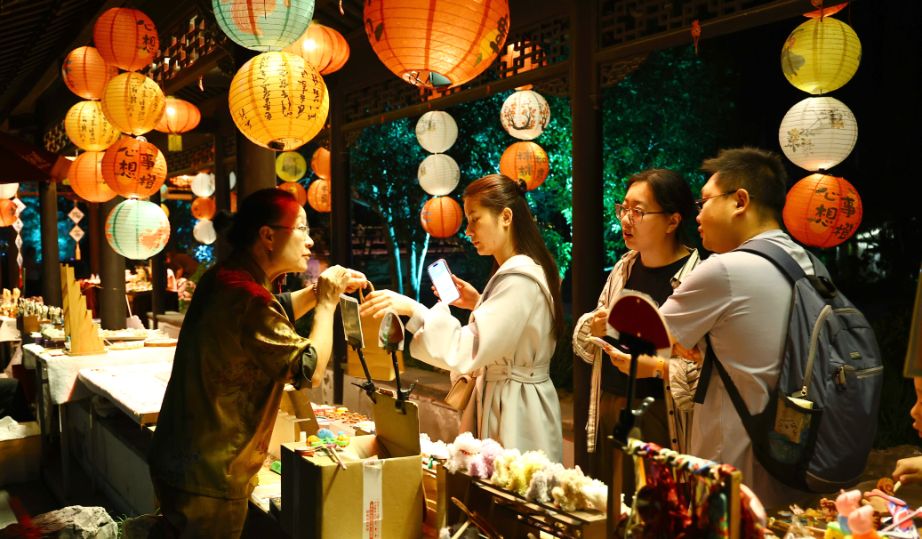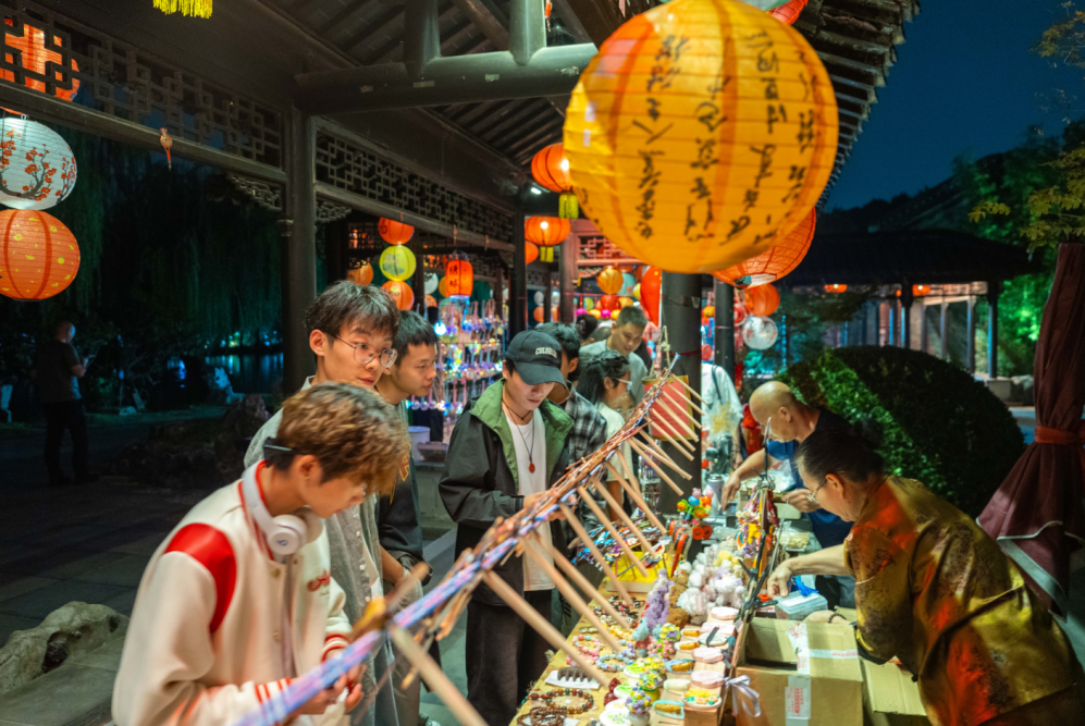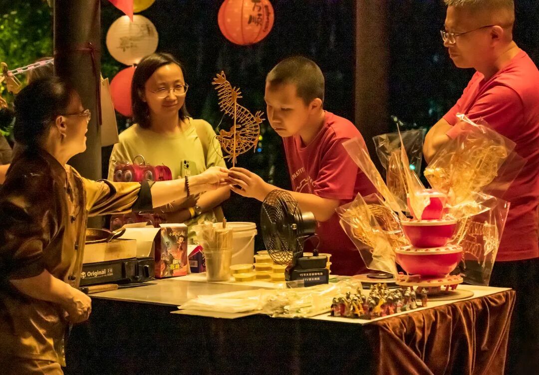 玲珑花界非遗市集夜间不打烊,红火的节日氛围扑面而来。花灯、画扇、绒花、糖画等非遗工艺品与文创产品摆满摊位,来自杭州的林女士逛得不亦乐乎。