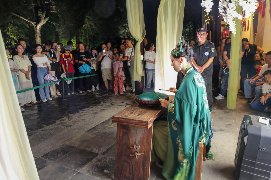 晚上七点,华灯初上,个园夜游大幕正式拉开。今年夜游创新采用“行进式观演+定点式互动”模式,游客移步换景间,便能沉浸式解锁多场园林实景演出:水榭草坪舞台上,踏鼓舞节奏明快、国潮竖筝旋律激昂;抱山楼北侧,“竹林月色”布景与古琴演出相得益彰;清漪亭内,清曲悠扬婉转。“太美了,这简直是绝美视听盛宴!” 来自上海的游客张先生忍不住赞叹。