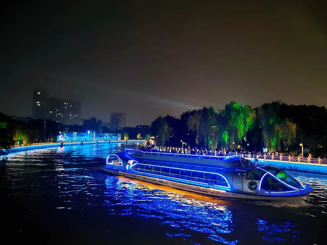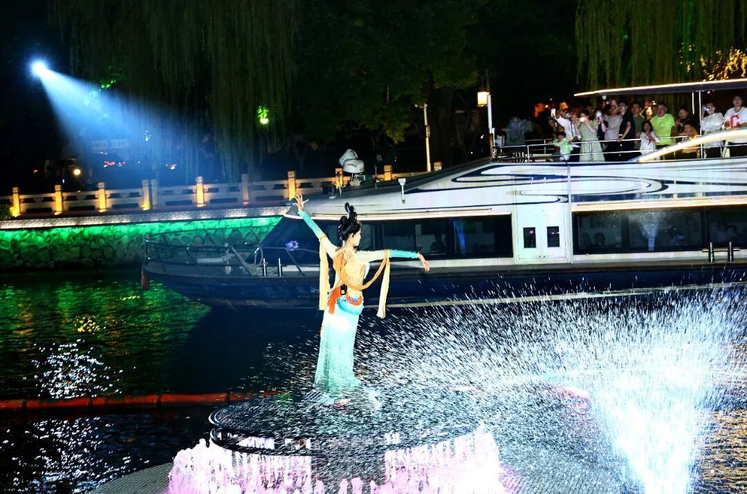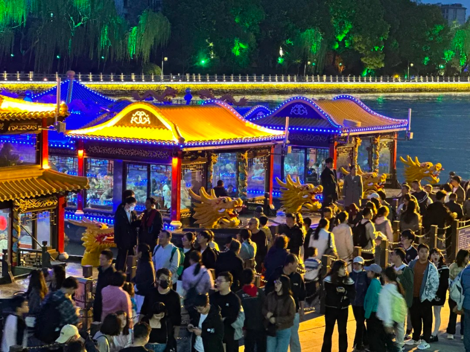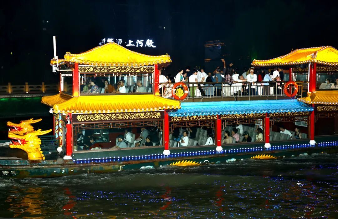 “船开起来的时候,两岸都是灯光秀,还有演员在岸边生动地演绎,耳边是古筝声,感觉瞬间穿越了!”来自苏州的王小姐和男友刚下游船,就迫不及待分享体验。双节期间游船每晚满座,一张船票解锁2500年运河繁华,船上互动不断,欢乐十足。