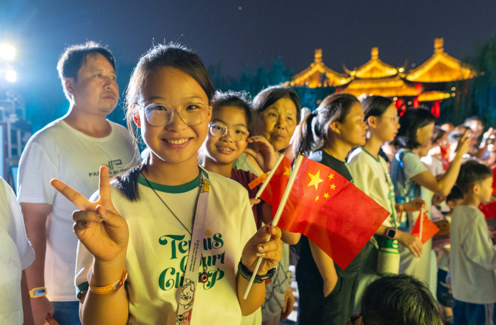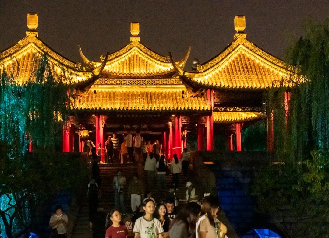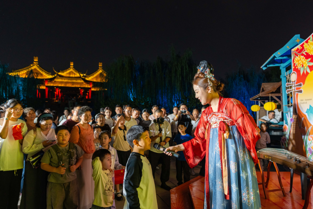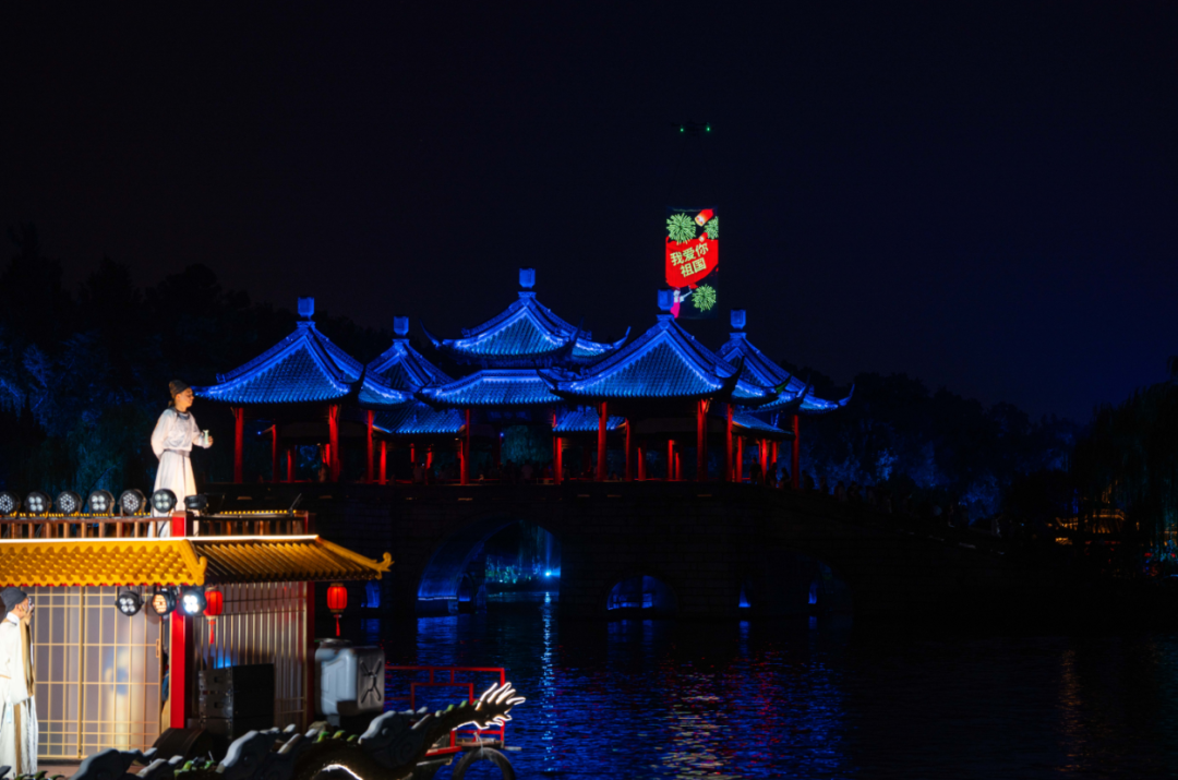 10月3日,瘦西湖“夜扬州”模式持续开启,五亭桥、二十四桥被灯光勾勒得如梦似幻。五亭桥北广场轮番上演“民乐演奏”“红歌快闪”等精彩演出。现场游客争相知识竞答,答对即有机会赢取精美礼品。身着唐装的NPC与演员们,手持红旗、宫灯缓步走过五亭桥,沿途不时与游客热情互动、合影打卡。