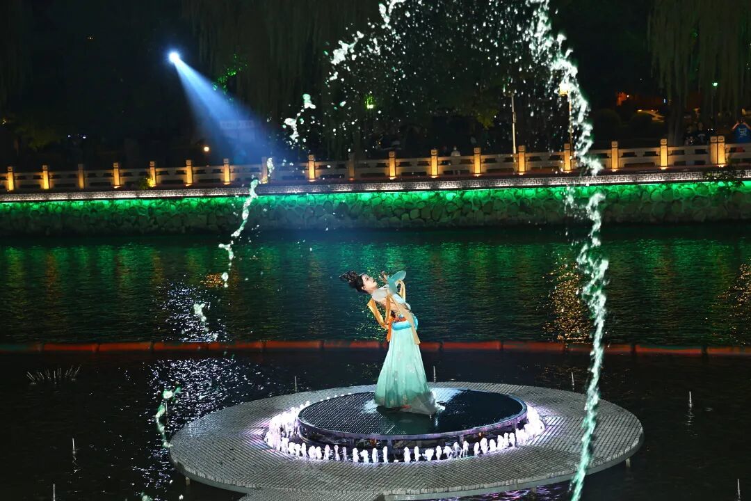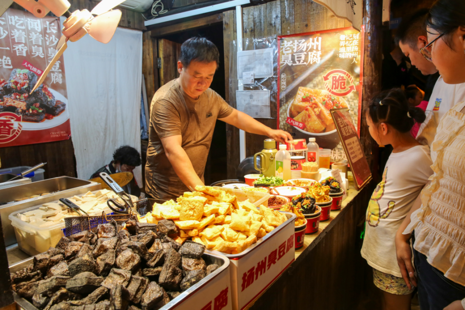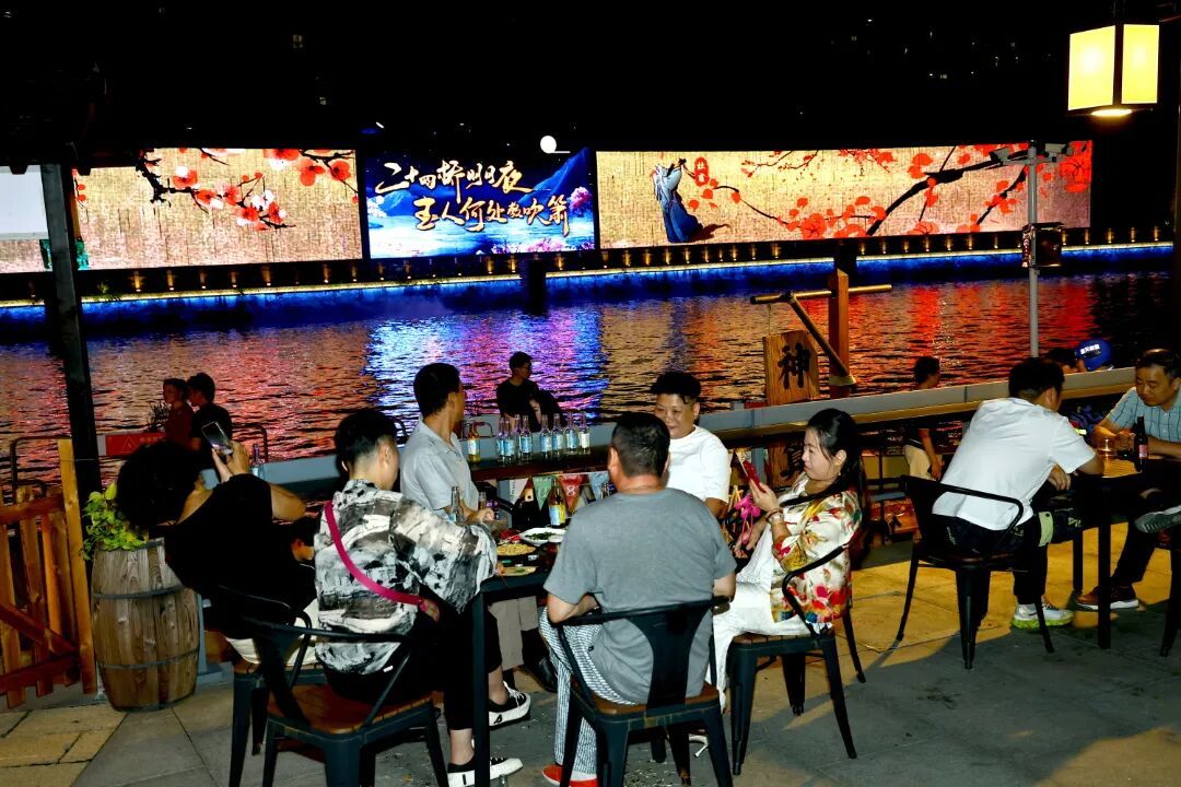 10月2日晚,运河盂城驿街区化身“明潮乐园”,“天宫赐福”“嫦娥奔月”舞蹈秀轮番上演,引得围观群众连连喝彩。闹市的摊贩、互动NPC摊位、农文旅集合,店前排起长龙,游客边吃边玩,不亦乐乎!